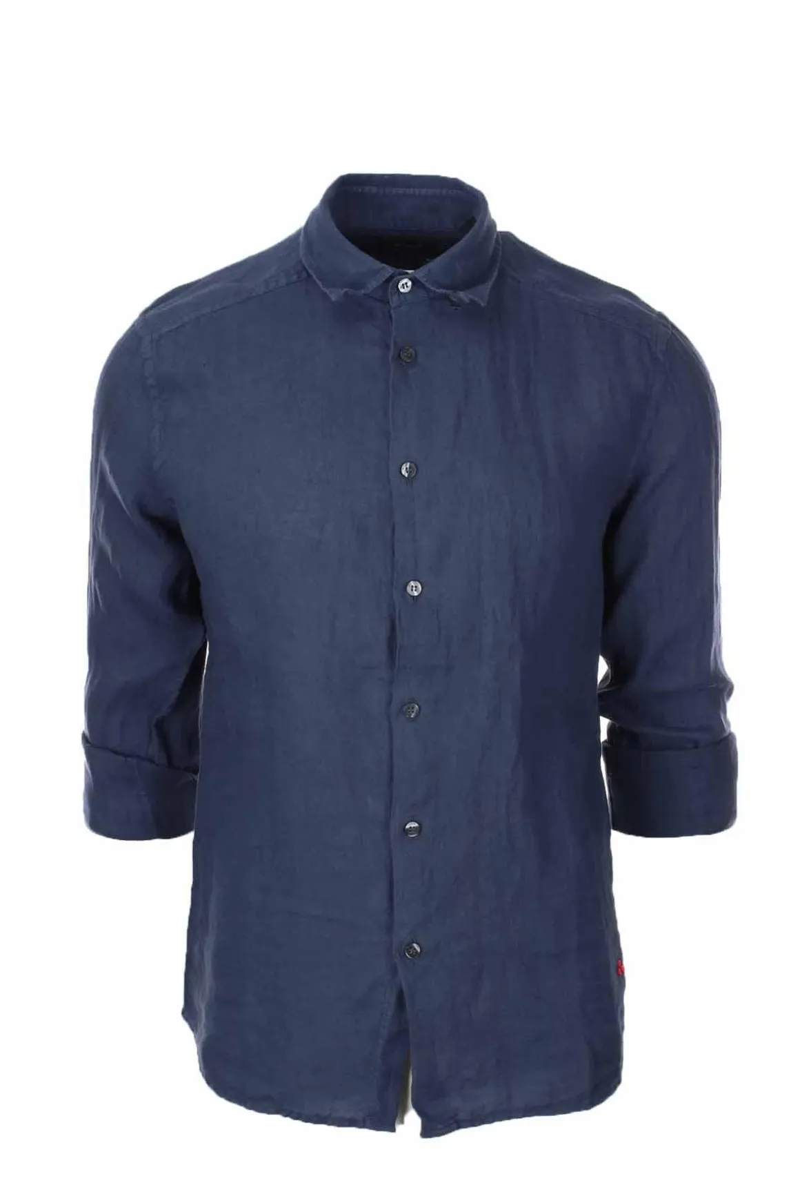 Camicia uomo manica lunga in lino, colletto morbodo sportivo, logo Peuterey con tre pallini rossi sul fondo, vestibilità regolare, 100% lino.