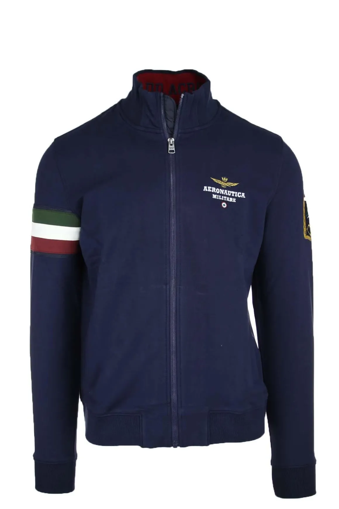 Felpa cardigan zip collo coreano Frecce Tricolori Aeronautica Militare Italiana, patch e tricolore sul braccio, interno collo con interno in contrasto e scritta, logo ricamato Aeronautica Militare, polsini e fondo vita in costina elasticizzata, vestibilità regolare, 100% cotone.
