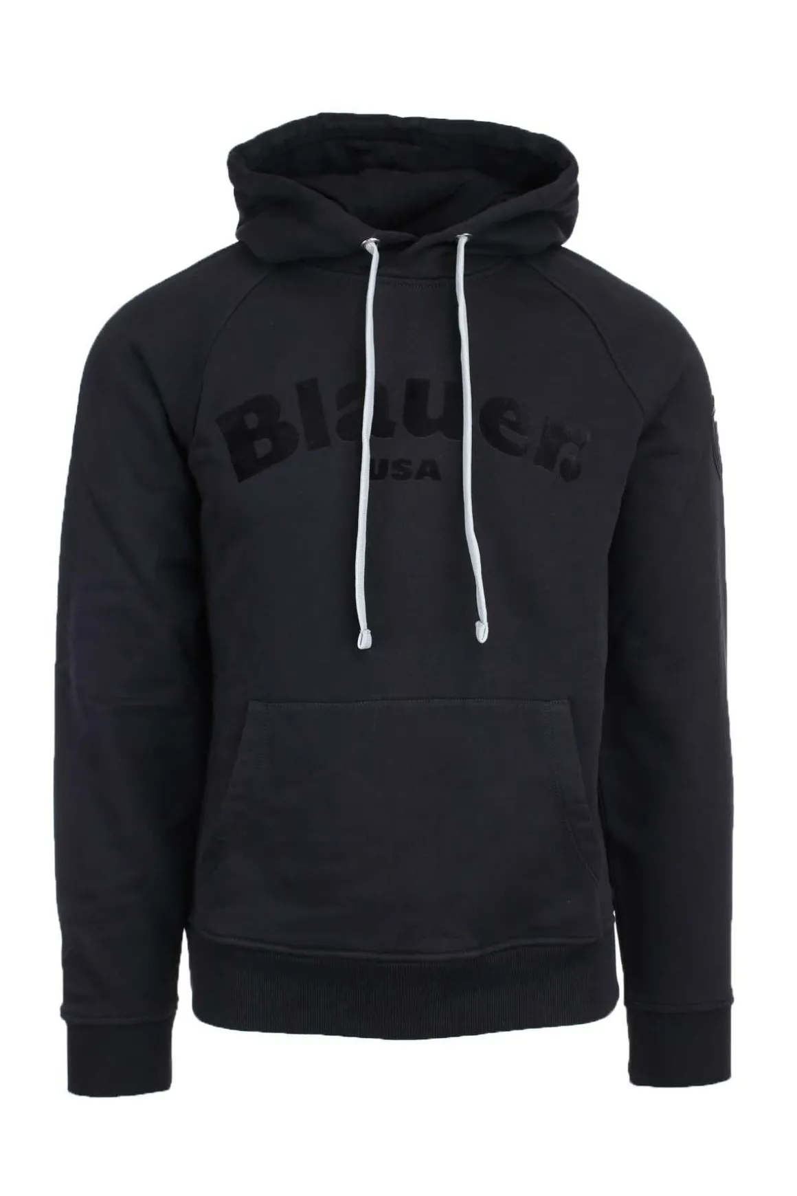 Felpa uomo con cappuccio, realizzata in morbida felpa di cotone, polsini e fondo vita elasticizzati, scudetto Blauer sul braccio, logo in tessuto vellutato sul davanti, tasche a marsupio, laccetto coulisse nel cappuccio, vestibilità regolare, 100% cotone.
