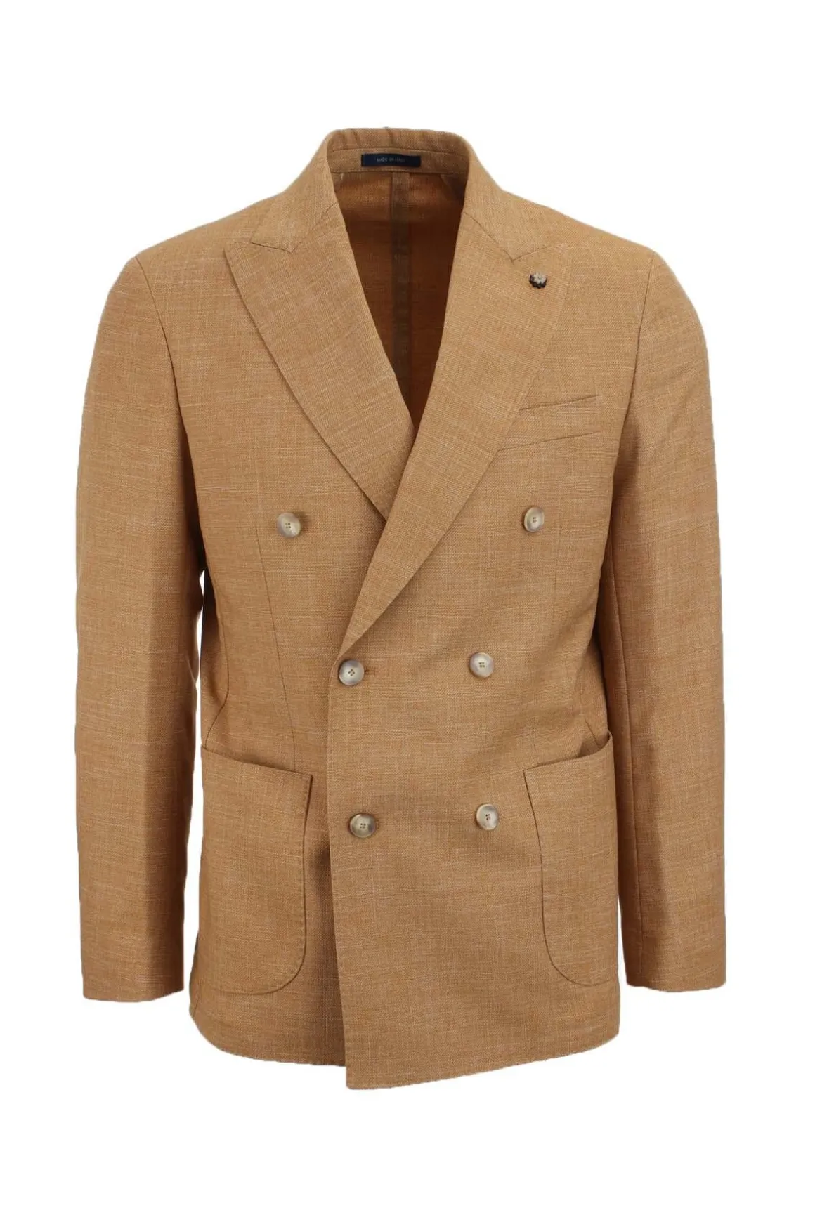 Giacca uomo doppiopetto 6 bottoni, realizzata in tessuto micropuntinato, leggero e morbido al tatto, tasche applicate, revers ampi, spacchetti laterali, interno sfoderato con tasche, vestibilità regolare, tessuto 85% poliestere, 13% viscosa, 2% elastan.