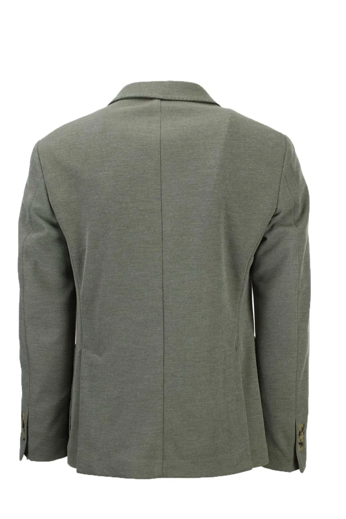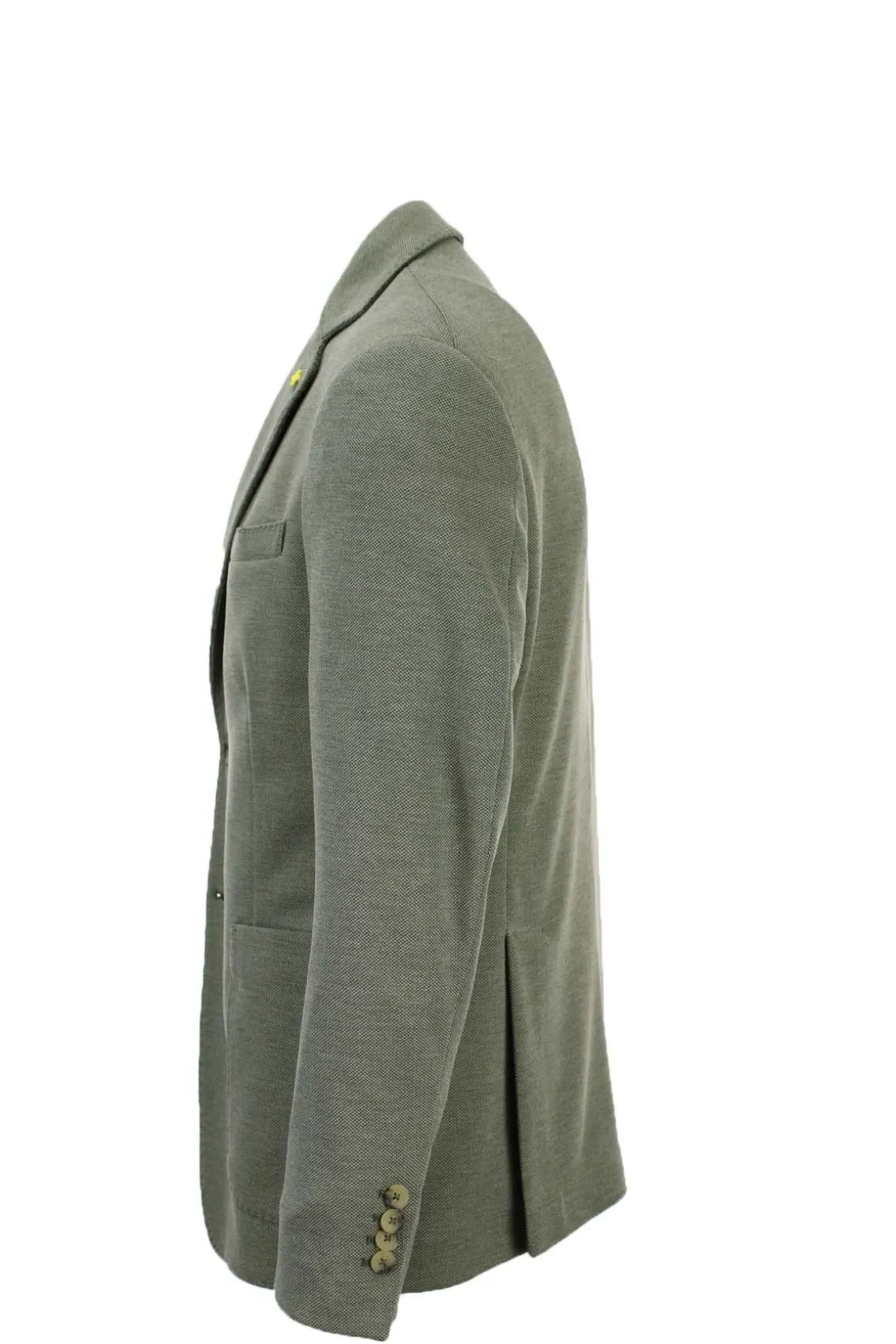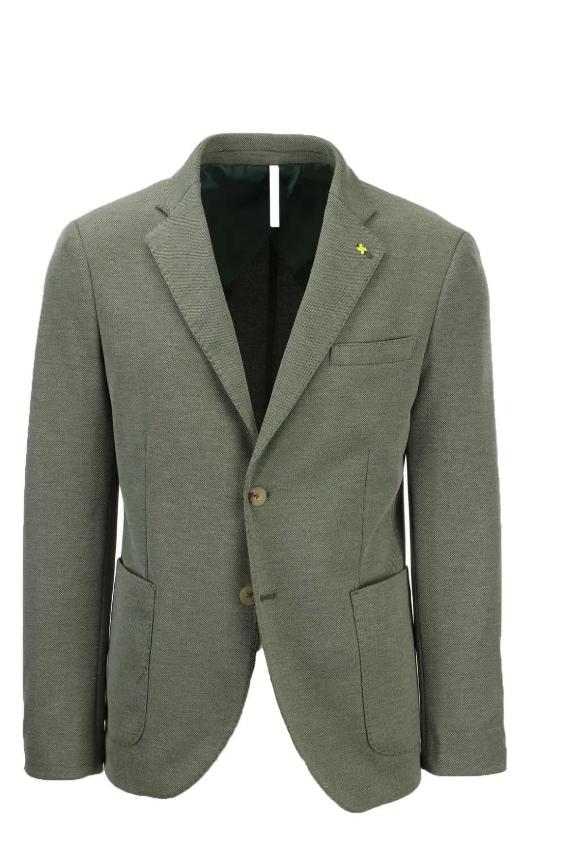 Giacca uomo monopetto 2 bottoni con spacchetti laterali, realizzata in tessuto stretch micropuntinato, tasche anteriori applicate, interno sfoderato con tasche, bordi impunturati in tinta, vestibilità regolare, 90% poliestere, 10% viscosa. Made in Italy.
