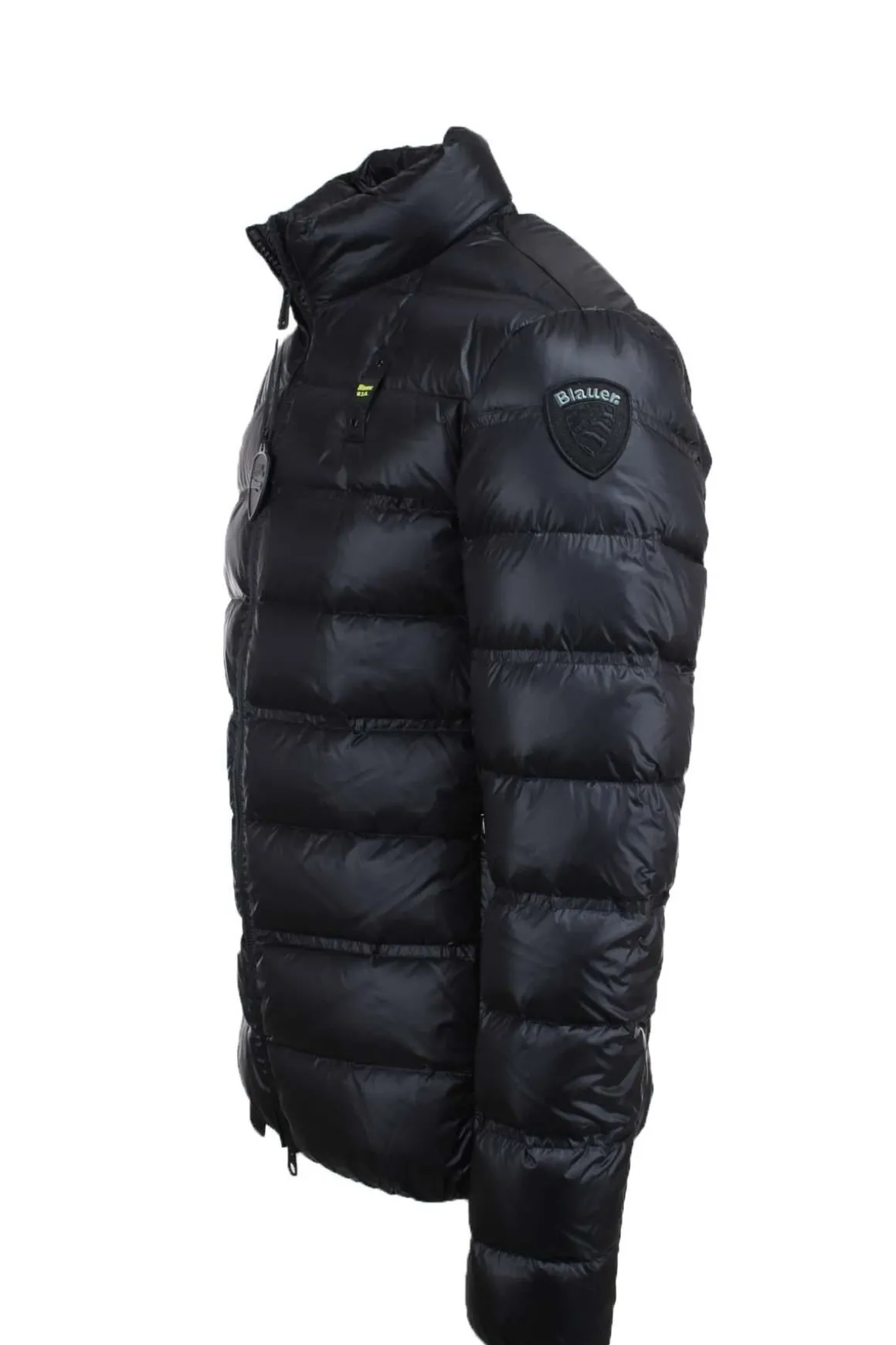 Giacca piumino senza cappuccio uomo Blauer, modello Belmont, collo alla coreana, chiusura con zip a scomparsa, tasche ai fianchi con zip, imbottitura in piuma naturale 185gr., impure orizzontali, identificativo passante e patch Blauer, elastico sul fondo vita, polsini con elastico, interno foderato in tinta con tasche, vestibilità regolare, si consiglia l’acquisto della taglia solita, tessuto 100% nylon.