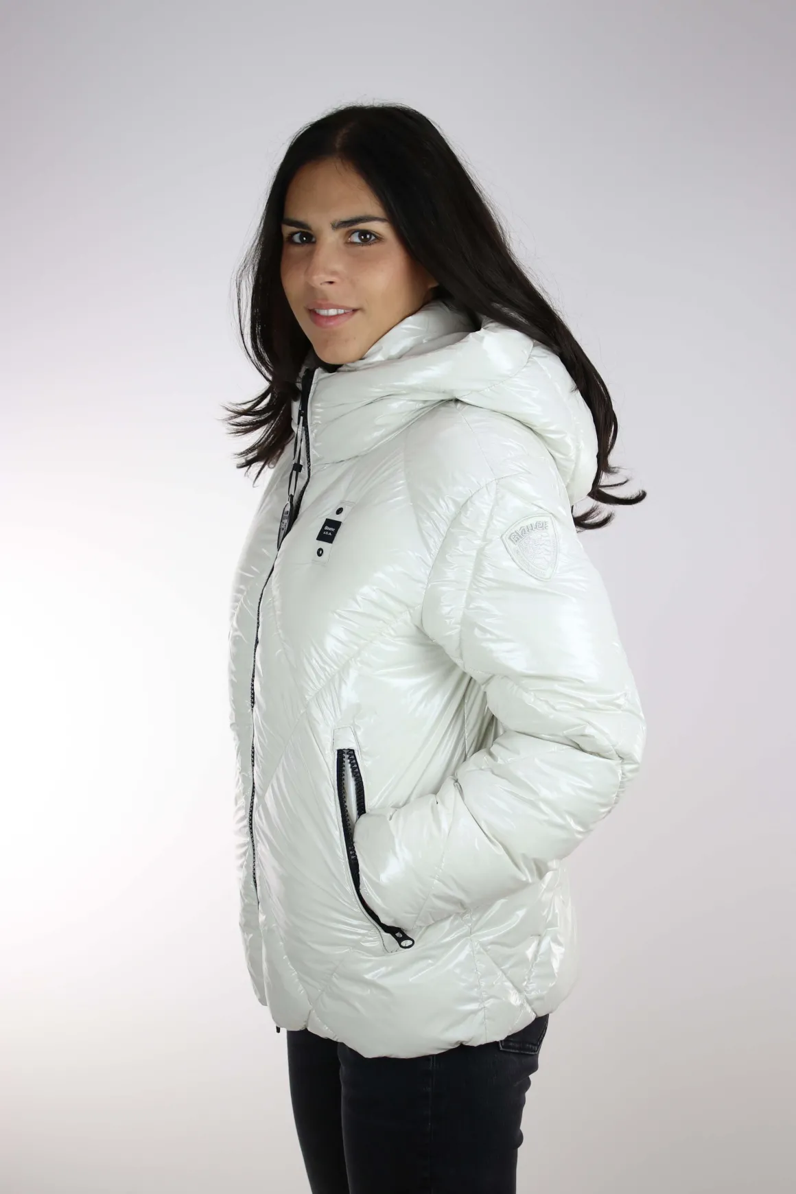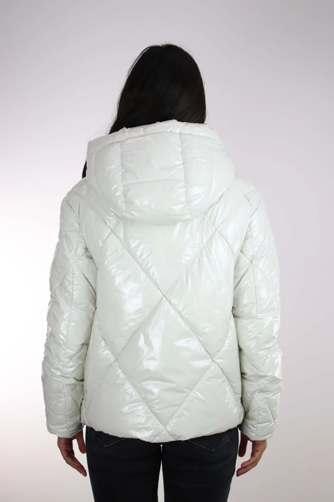 Giubbotto donna Blauer, realizzato in tessuto laccato lucido idrorepellente, imbottitura ecologica Sorona by Aura impunturato a rombi, cappuccio fisso, chiusura full zip, tasche ai fianchi con zip, coulisse regolabile sul fondo, interno foderato in tinta con tasche, vestibilità regolare, la modella è alta 175 cm e indossa la taglia S.