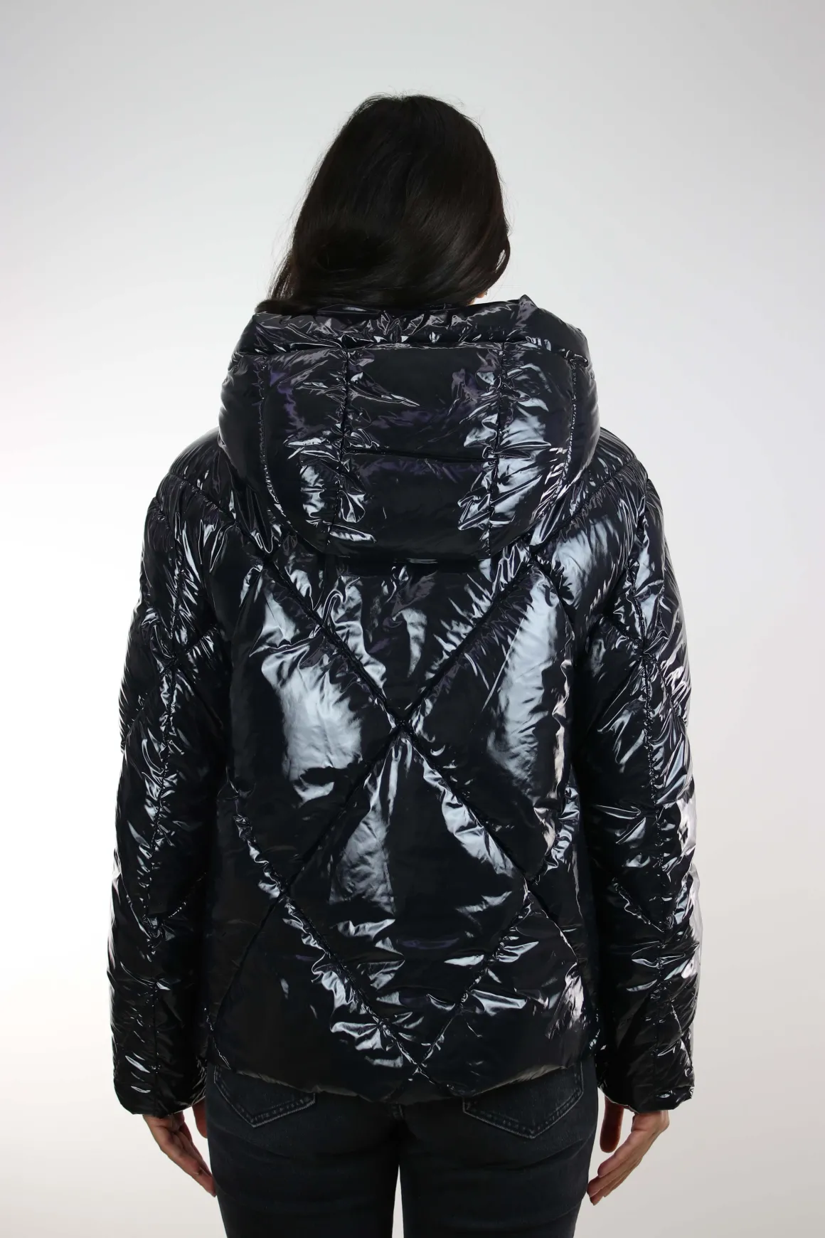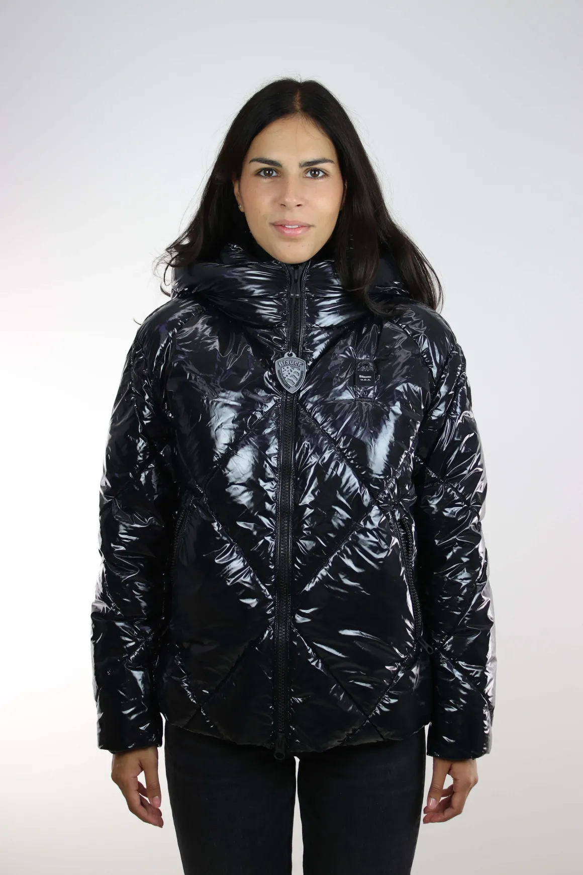 Giubbotto donna Blauer, realizzato in tessuto laccato lucido idrorepellente, imbottitura ecologica Sorona by Aura impunturato a rombi, cappuccio fisso, chiusura full zip, tasche ai fianchi con zip, coulisse regolabile sul fondo, interno foderato in tinta con tasche, vestibilità regolare, la modella è alta 175 cm e indossa la taglia S.