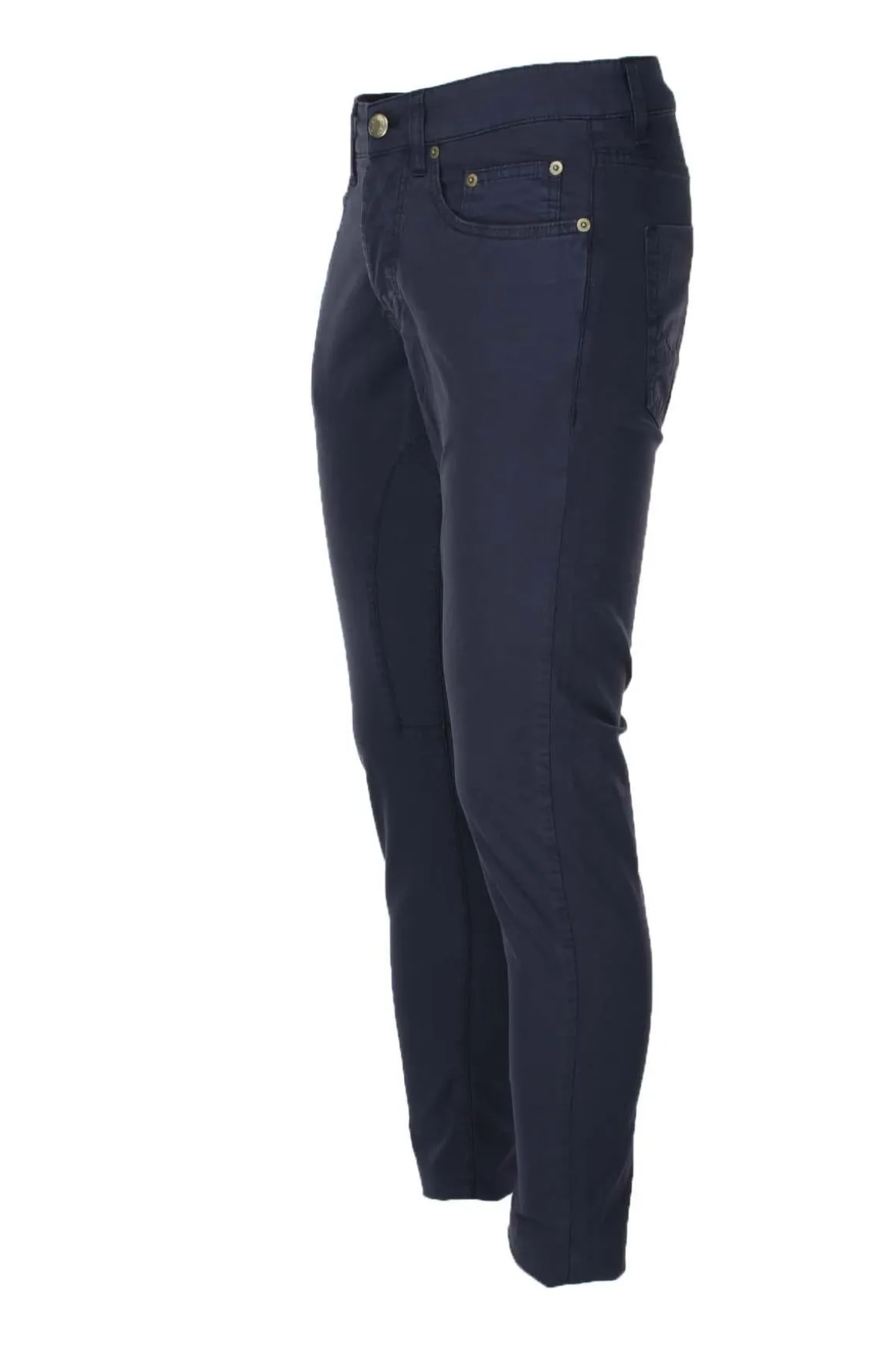 Pantalone uomo in raso di cotone stretch, 5 tasche, chiusura bottoni in metallo, borchie in metallo, vestibilità regolare, fondo 17cm, 98% cotone, 2% elastan.
