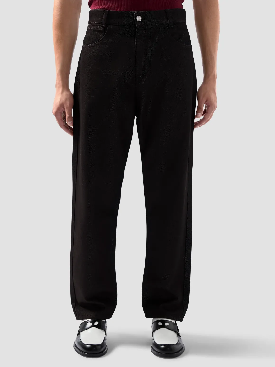 Jeans denim 5 tasche in denim trattato, vita media, cavallo leggermente basso, gamba asciutta, vestibilità carrot fit, chiusura zip con bottone, logo con scritta in contrasto posteriore, 98% cotone, 2% elastan.