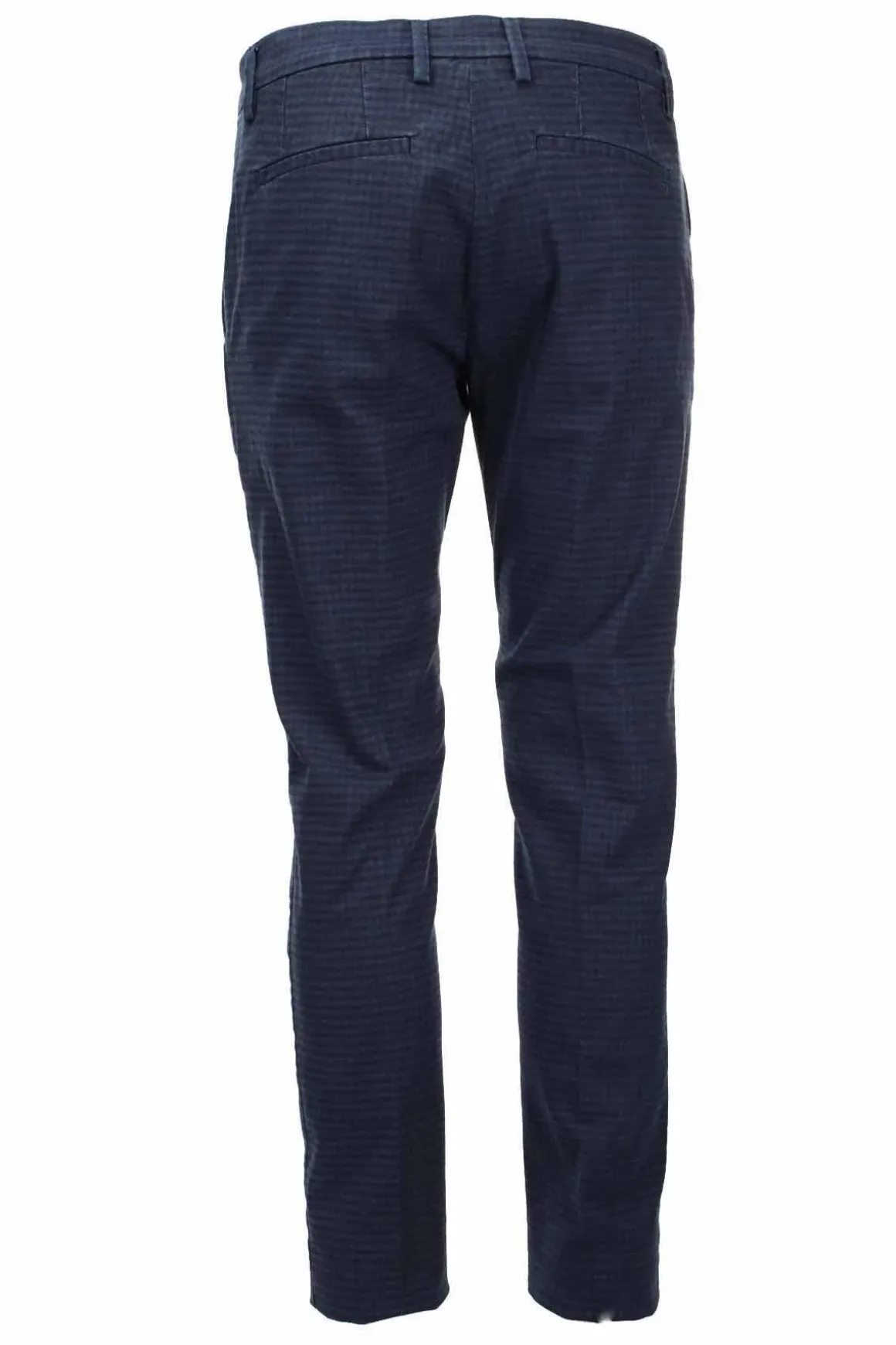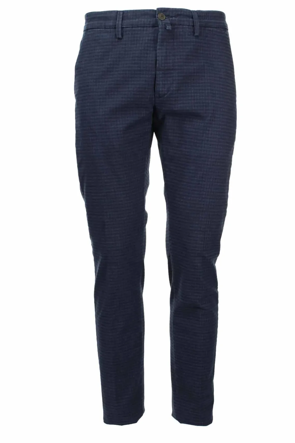 Chiusura con zip, tasche anteriori oblique, doppia tasca posteriore a filo, tessuto a micro quadri elasticizzato, fondo 16cm, vestibilità regular fit, 98% cotone 2% elastan.