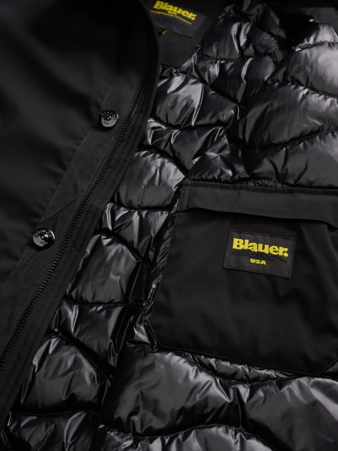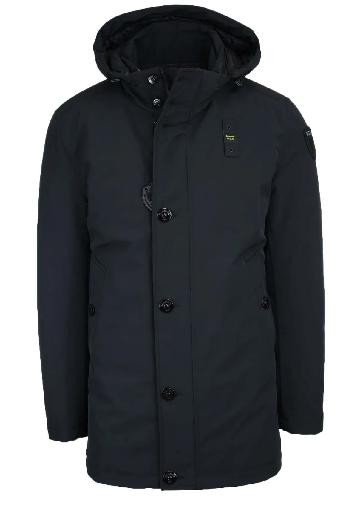Parka uomo chiusura centrale con zip coperta da pattina e bottoni, tasche ai fianchilungo in neoprene con cappuccio rimovibile tramite zip, capo comodo, caldo e poco ingombrante grazie all’imbottitura in piuma 175 gr., chiusura centrale con zip coperta da pattina e bottoni, tasche ai fianchi, passante e patch con logo Blauer, interno trapuntato con tasche e zip, vestibilità regolare.