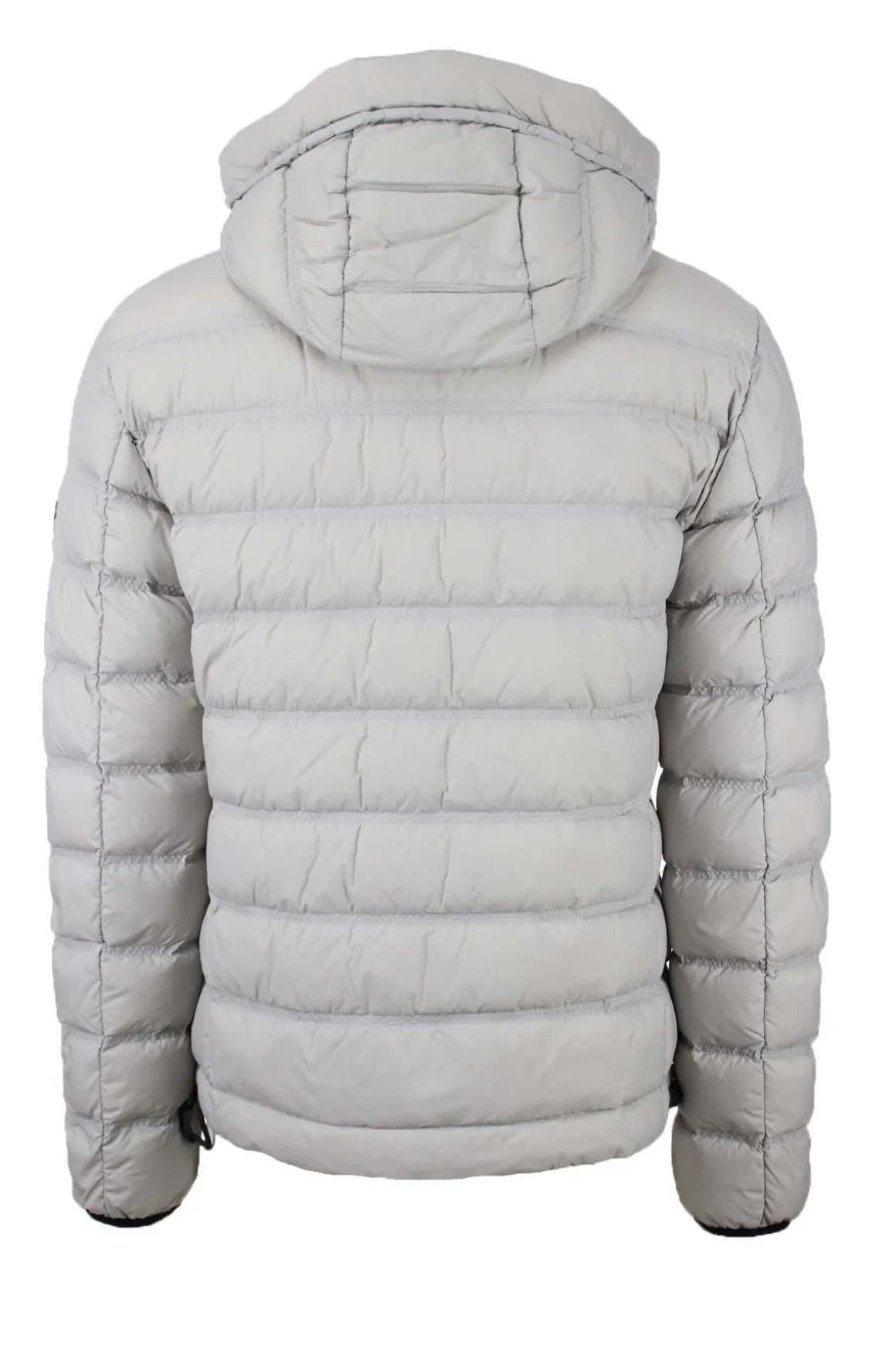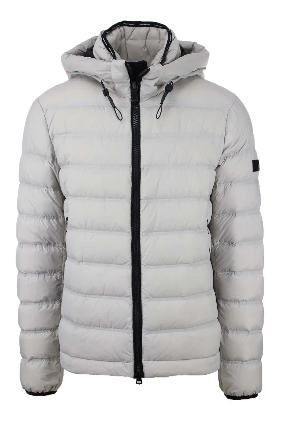 Piumino uomo Peuterey per affrontare comodamente e con stile la stagione fredda, chiusura centrale con zip doppio cursore, collo alto full zip, cappuccio staccabile, tasche ai fianchi con zip, laccio elastico coulisse in vita per una migliore vestibilità, logo Peuterey sul braccio, collo e polsini bordati con nastro logato, vestibilità regular, imbottitura in vera piuma, tessuto nylon 100%.