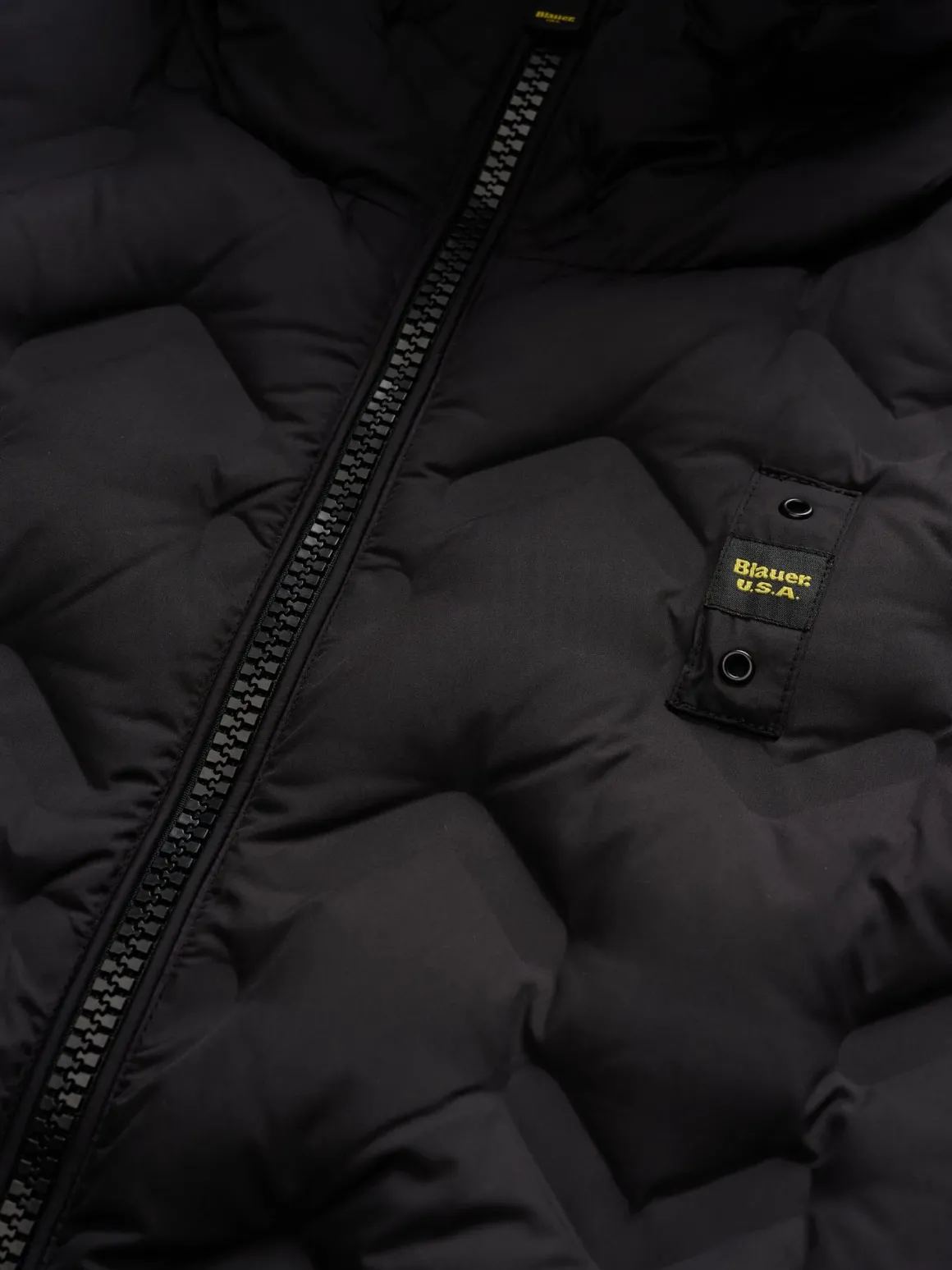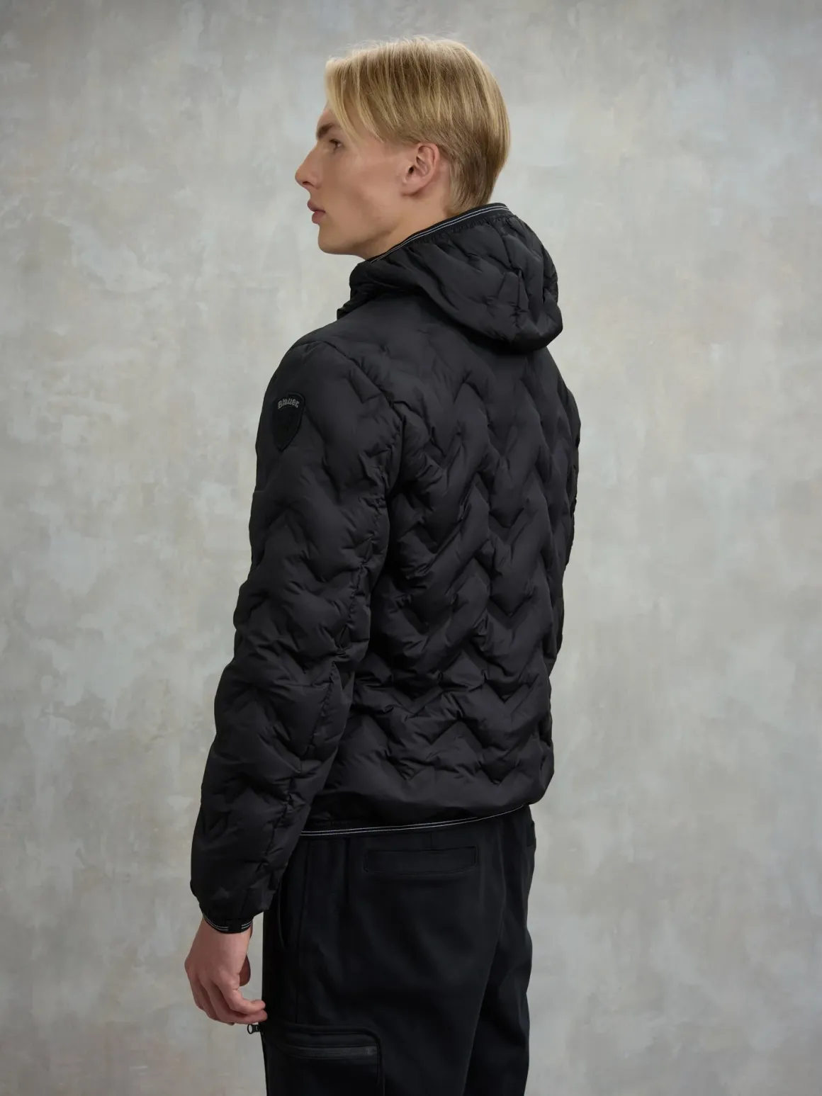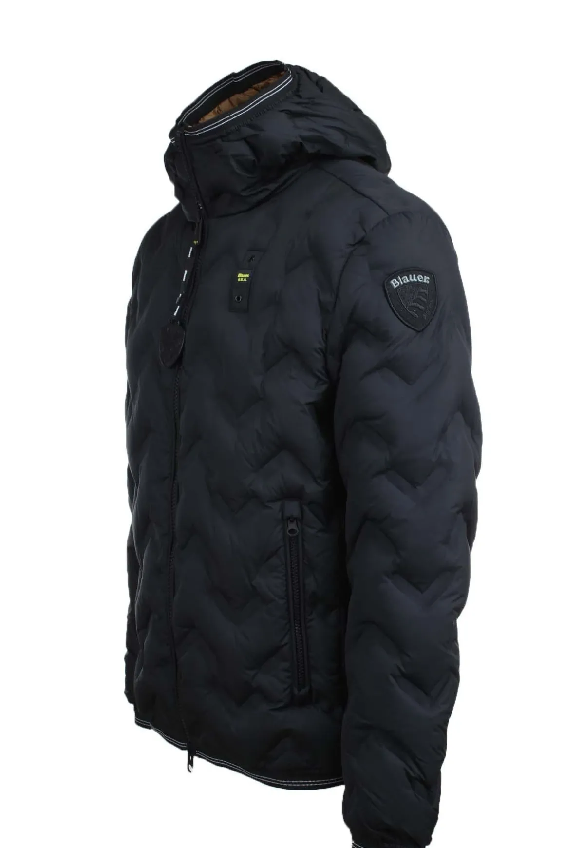 Novità della collezione Blauer uomo, il piumino Piery con cappuccio fisso e impunture asimmetriche, realizzato con l’esclusivo tessuto in poliestere, imbottito in piuma 190 gr., chiusura centrale con zip, tasche ai fianchi con zip, fondo vita e polsini con elastico rigato, interno foderato in contrasto di colore con tasche, patch e passante Blauer, vestibilità regolare.