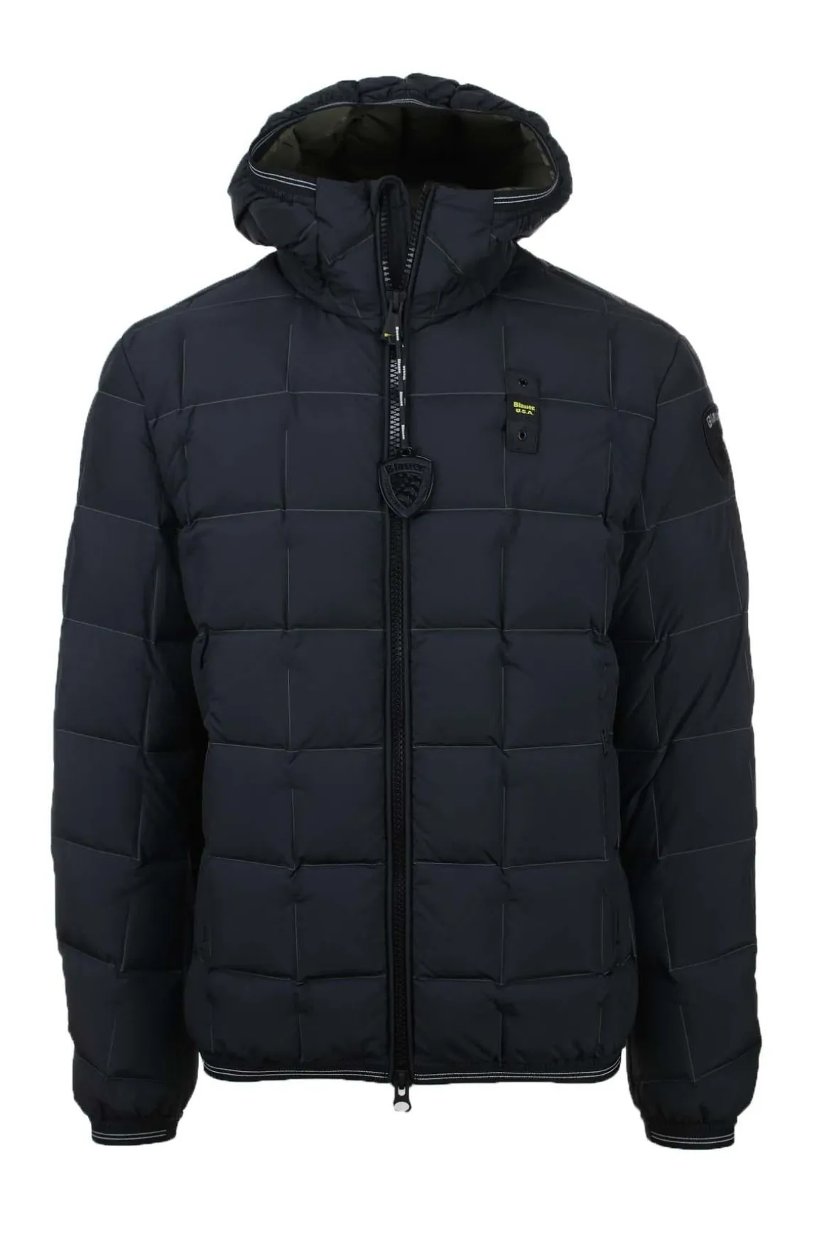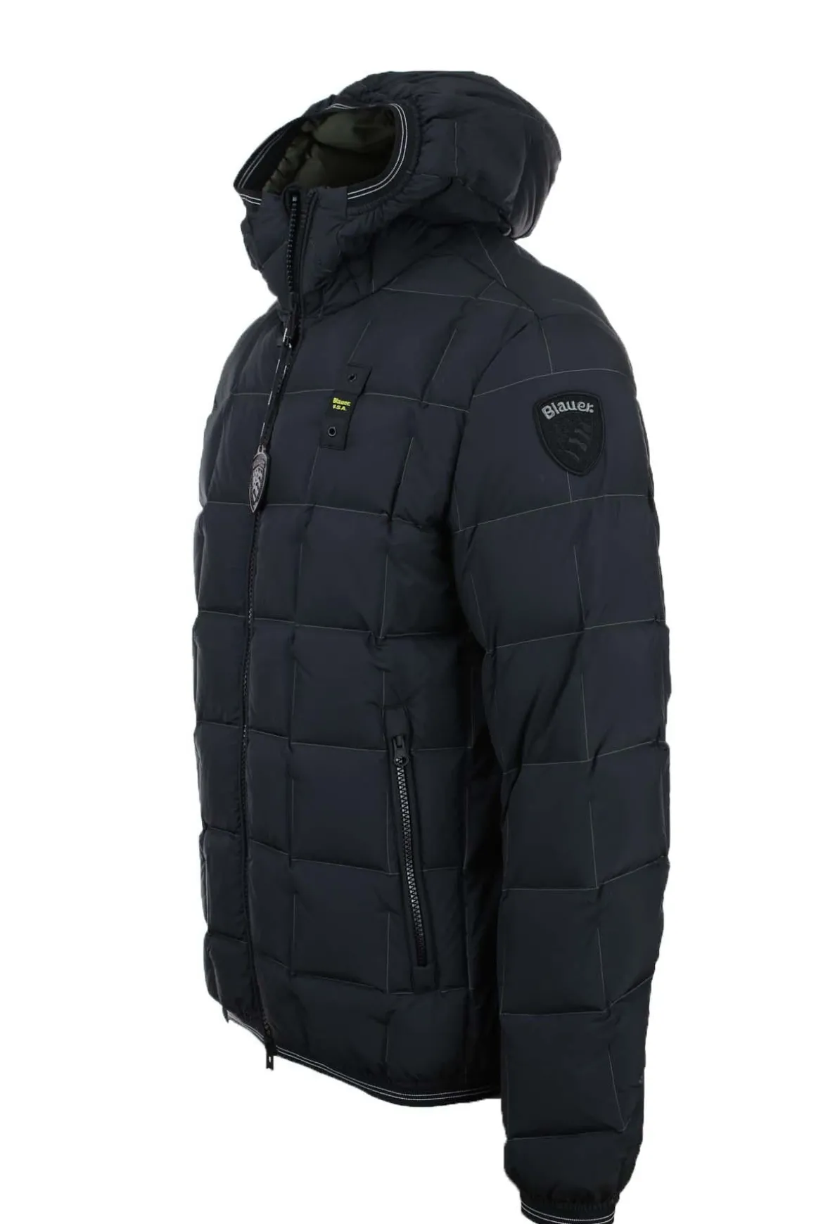 New entry nella collezione Blauer, modello Dalin New, bomber realizzato in nylon opaco, imbottito in vera piuma naturale, impunturato con motivo a quadri, cappuccio fisso, chiusura centrale con zip, tasche ai fianchi con zip, fondo vita e polsini con elastico rigato, logo Blauer nel Patch e passante sul petto, interno foderato con tasca, vestibilità regolare.