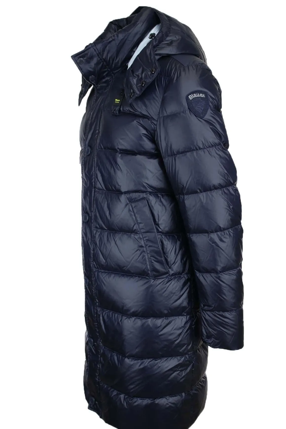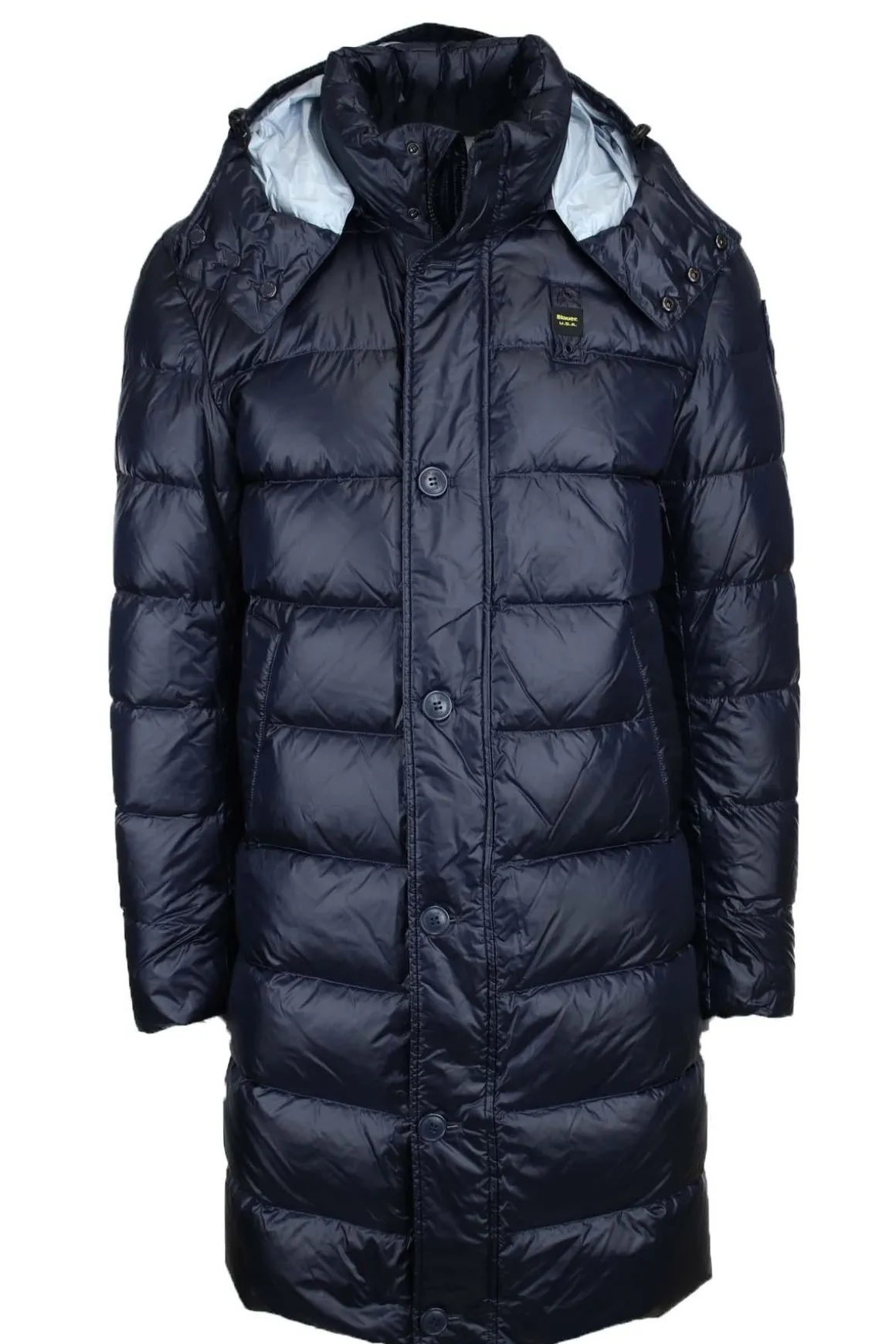 Piumino lungo Blauer uomo, chiusura centrale con zip doppio cursore coperta da pattina e bottoni, tasche anteriori oblique con bottone a pressione, passante Blauer sul petto e patch sul braccio, cappuccio rimovibile tramite zip, collo alla coreana con bottoni a pressione, interno con tasche e fodera in contrasto di colore, maniche con polsino elastico, coulisse interna in vita e nel cappuccio, tessuto 100% nylon, imbottitura sintetica ecologica Repreve Blauer, vestibilità regular fit.