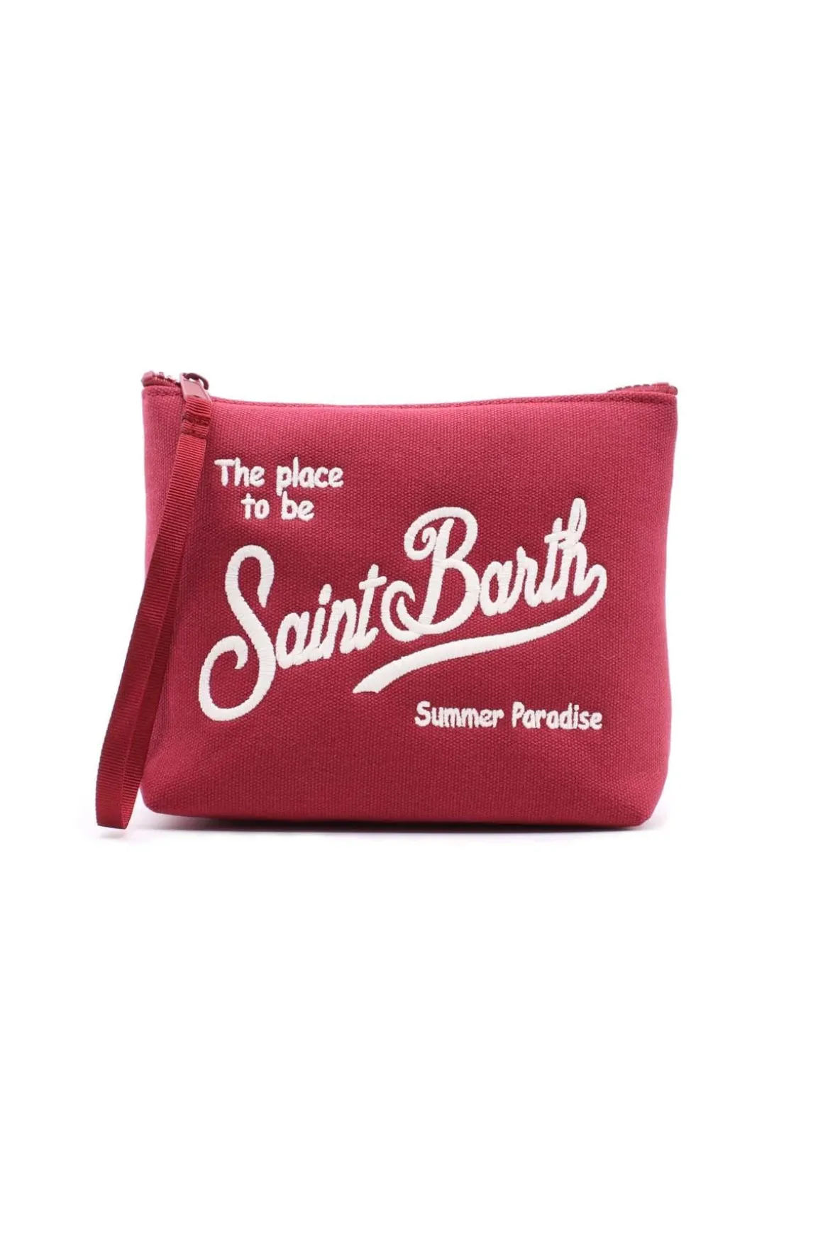 Pochette Aline MC2 Saint Barth in canvas unito con stampa logo lettering e manico da polso, accessorio pratico dal design essenziale e contemporaneo.