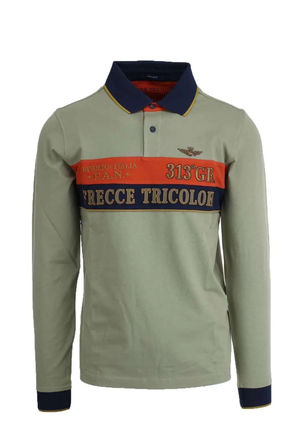 Polo ufficiale Frecce Tricolori Rivolto, colletto tre bottoni, polsini in costina elasticizzata, fondo vita con spacchetti laterali, logo Aeronautica Militare Italiana, vestibilità regolare, tessuto in jersey e piquet elasticizzato multicolor, 95% cotone, 5% elastan.