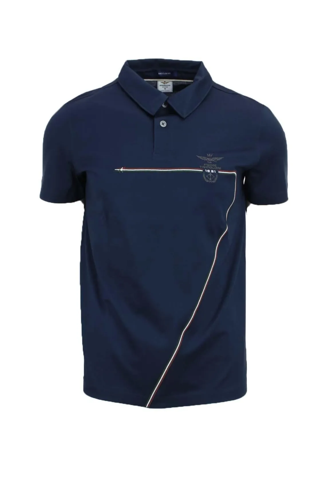Polo mezza manica uomo Frecce Tricolori Aeronautica Militare, realizzata in cotone jersey mercerizzato con un aspetto luminoso e morbido al tatto, colletto tre bottoni, logo Frecce Tricolori, più lunga dietro, vestibilità regolare, 100% cotone.