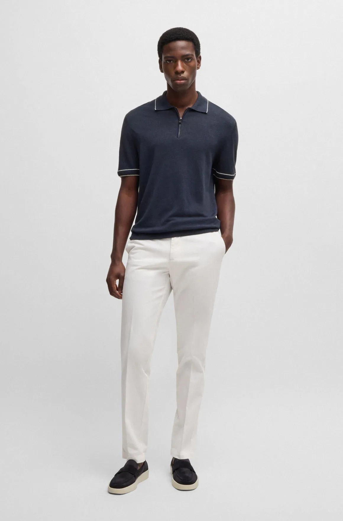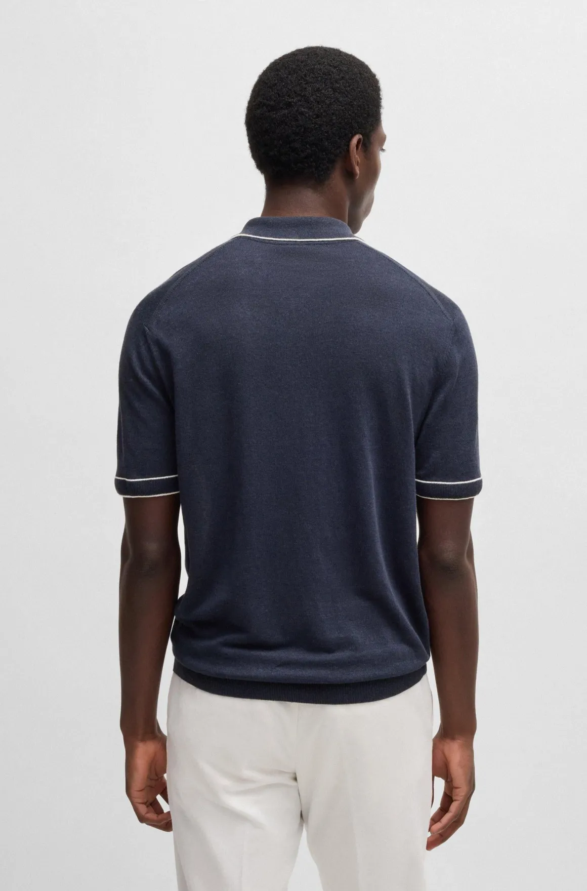 Polo mezza manica in filo di misto lino, profili in contrasto su collo e maniche, chiusura con zip, logo boss a bandiera sul fianco, vestibilità regolare/comoda, si consiglia acquistare una taglia inferiore alla solita, capo leggero e confortevole dallo stile fashion da indossare tutta l’estate, 56% lino, 44% viscosa.