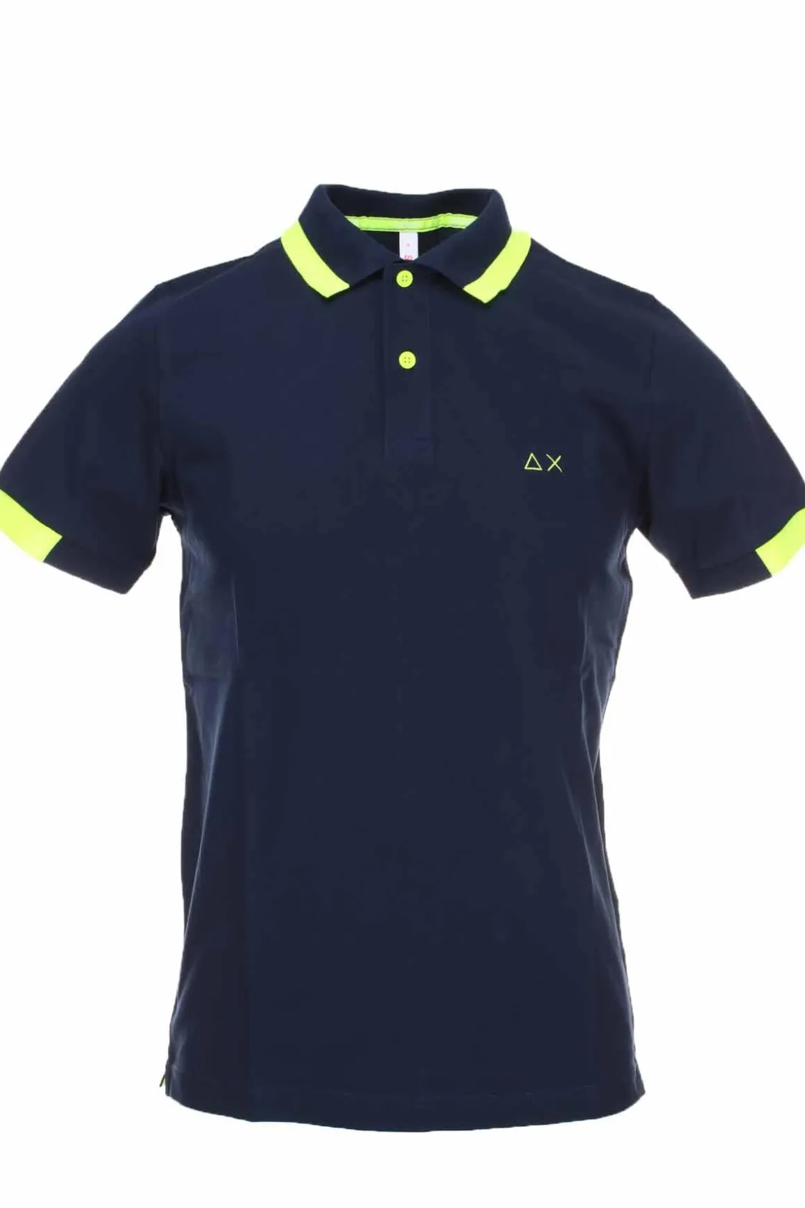 Abbottonatura due bottoni, bordi del collo e delle maniche in contrasti fluo, logo Sun68 ricamato sul petto, spacchetti laterali, vestibilità slim fit, 100% cotone piquet.