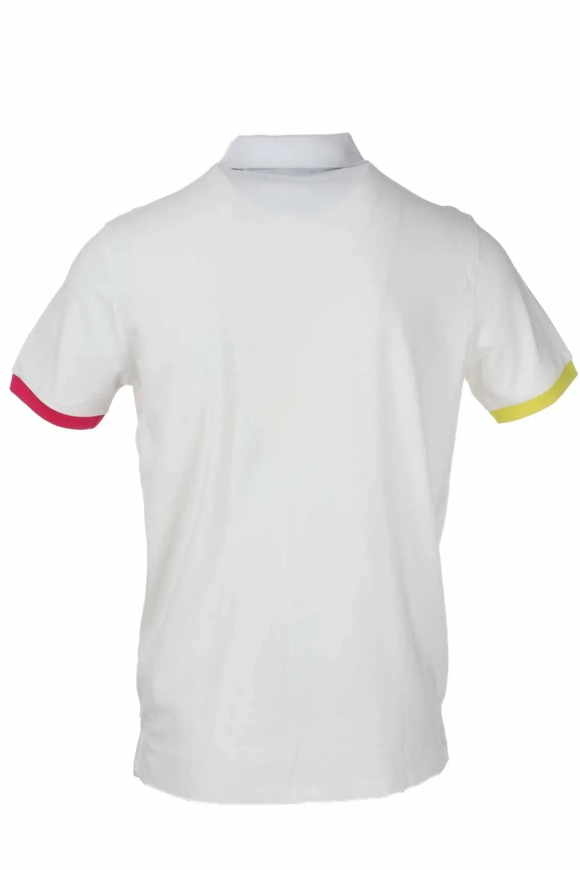 Colletto a due bottoni, bordo maniche con profili multicolor, logo US POLO ASSN ricamato sul petto, spacchetti sul fondo con dietro più lungo, sottocollo in contrasto con scrita Us Polo Assn, 100% cotone piquet.