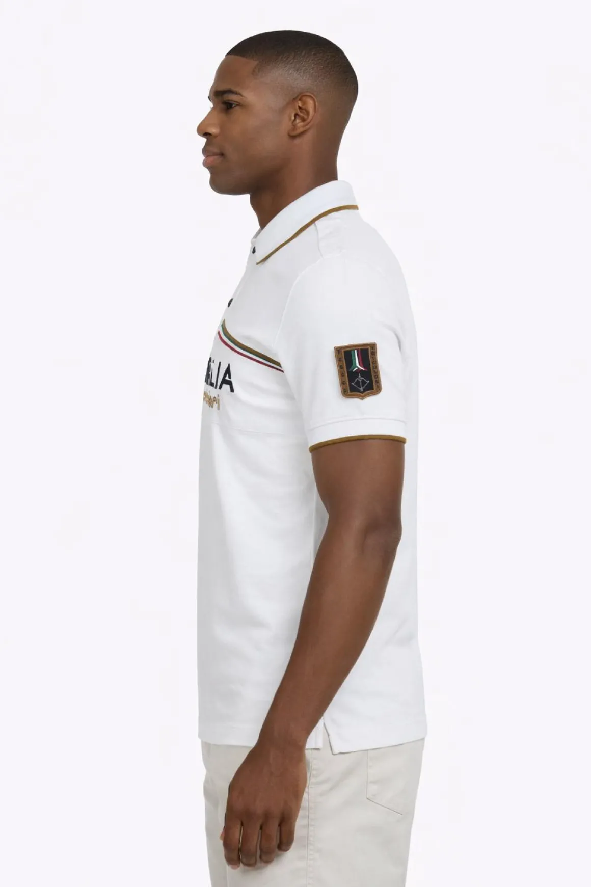 Polo Aeronautica Militare uomo in piquet di cotone con ricamo MB 339 Italia Frecce Tricolori, profili oro e vestibilità regolare dal carattere sportivo e distintivo. Realizzata in piquet di cotone traspirante e confortevole, garantisce una vestibilità regolare ideale per un look casual curato. I profili oro sulle maniche valorizzano il design, mentre il ricamo MB 339 Italia richiama l’iconico velivolo delle Frecce Tricolori. Gli spacchetti laterali sul fondo migliorano la vestibilità e assicurano maggiore libertà di movimento. Perfetta da abbinare a jeans, pantaloni casual o bermuda per uno stile dinamico e riconoscibile. Scoprila ora su PrestigeModaUomo e completa il tuo guardaroba con una polo dal forte carattere.