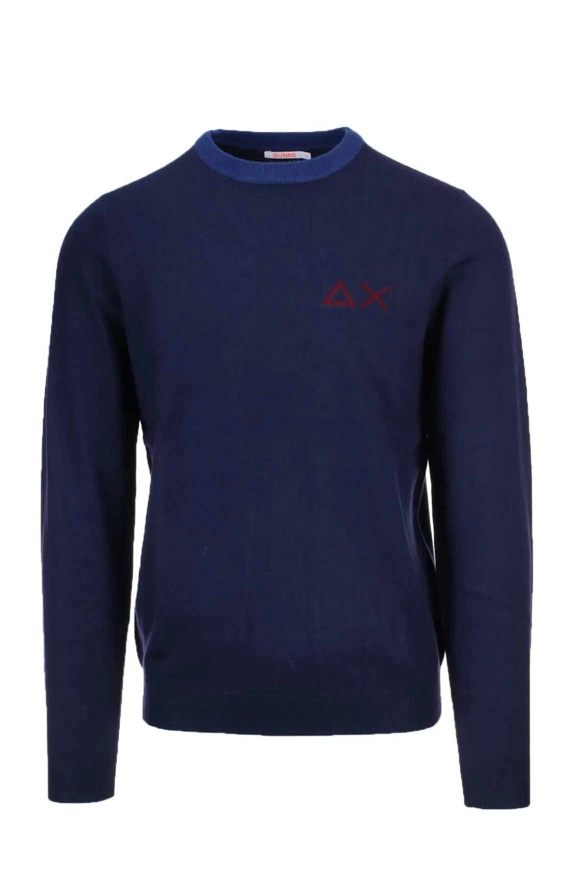 Pullover uomo SUN68, tinta unita con logo in evidenza sul petto e dettagli in contrasto, morbidissimo filato in lana e cotone pesantezza media, polsini e fondo vita elasticizzati, vestibilità slim fit, 50% lana 50% cotone.
