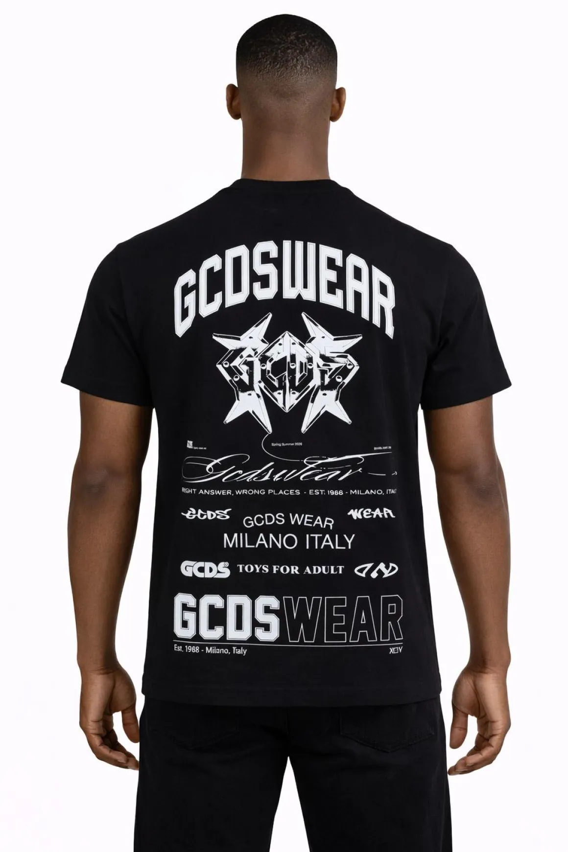 T-shirt GCDS in jersey di cotone con stampa frontale e posteriore GCDS Wear, vestibilità regolare e design d’impatto ispirato alla storia del brand.