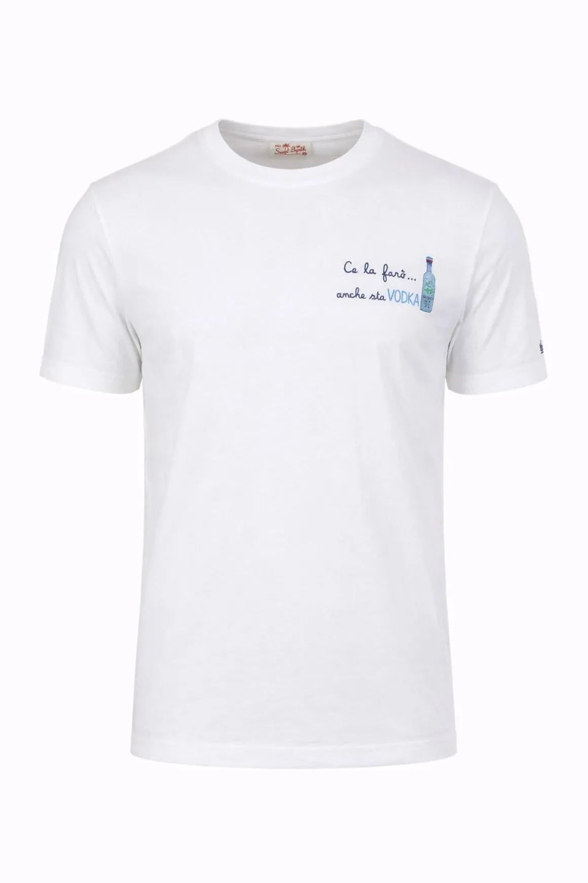 T-shirt MC2 Saint Barth da uomo realizzata in cotone jersey morbido e traspirante. Il modello presenta la stampa “Ce la farò anche sta vodka” e il logo ricamato sul braccio, dettagli iconici del brand. Sul retro del collo è presente la bandiera a scacchi bianco e rosso, mentre la vestibilità regolare garantisce comfort e uno stile casual contemporaneo.