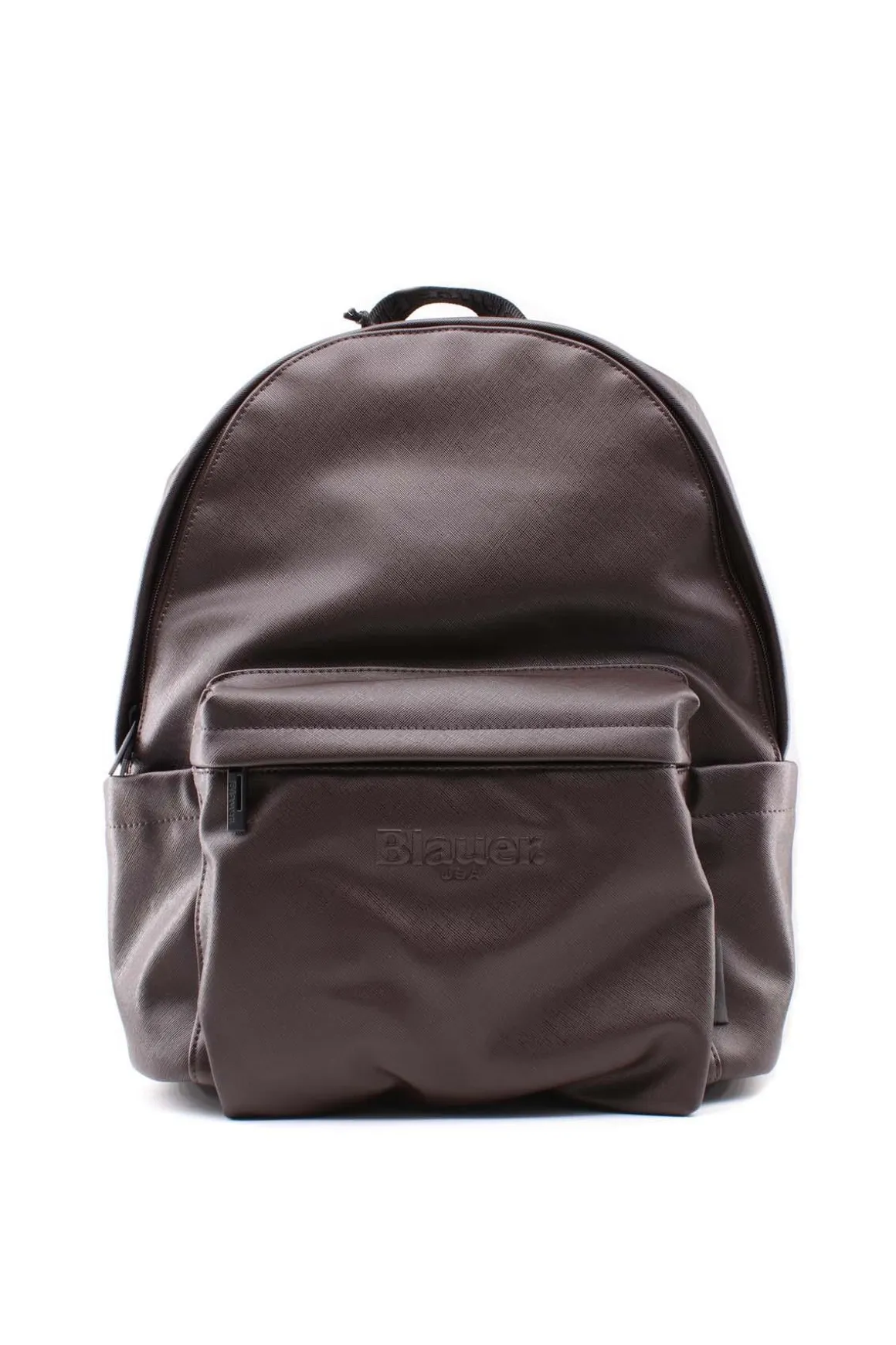 Zaino Blauer realizzato in ecopelle effetto saffiano con logo in sovrimpressione, chiusura con zip a scomparsa, tasche esterne, bretelle regolabili imbottite per un miglior confort, manico per trasporto a mano, interno imbottito con tasca per mini pc o tablet, tasca con zip e soffietto porta penne, dimensioni cm. 34 x 36 x 15.