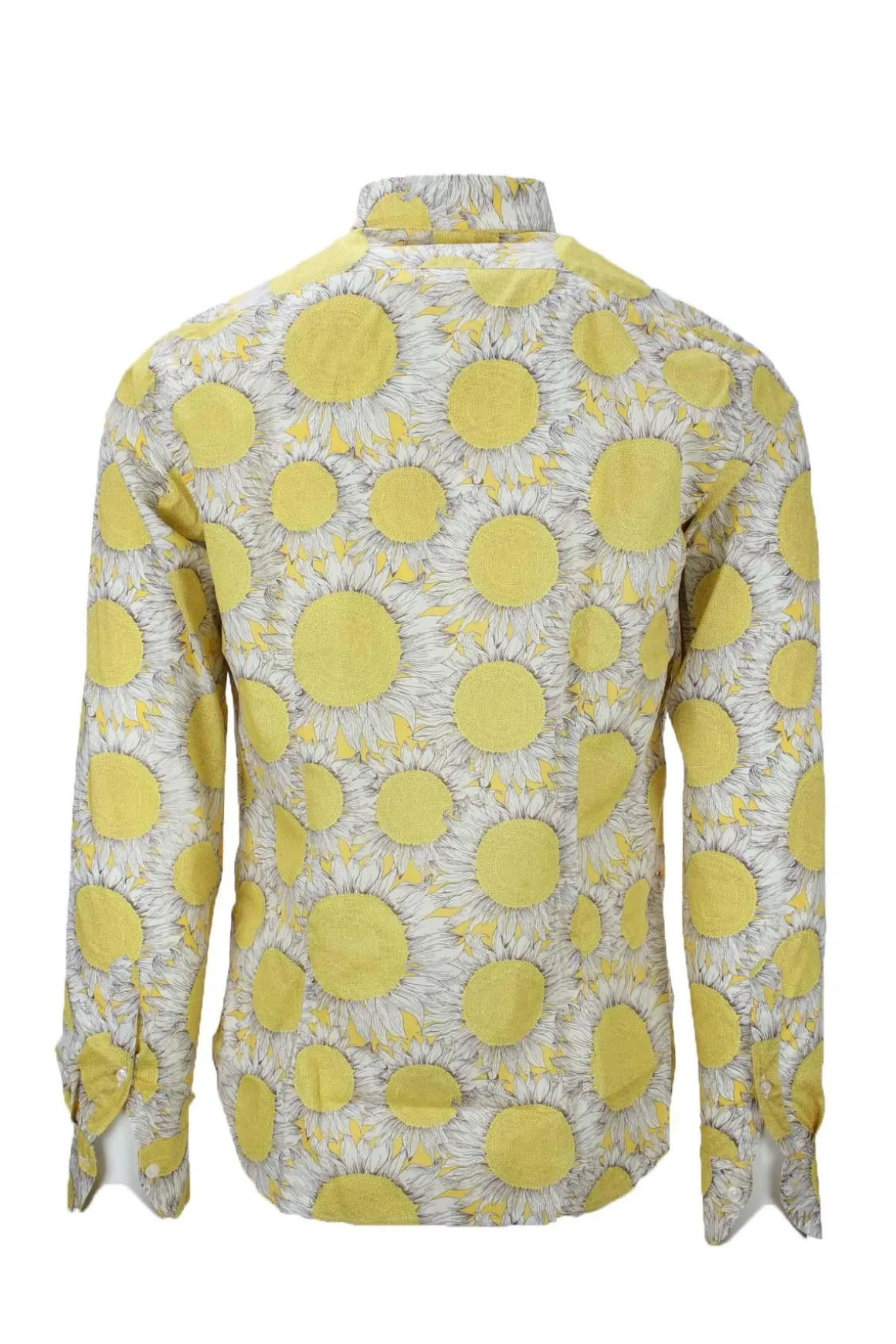 Camicia sportiva uomo manica lunga fantasia girasoli, colletto morbido con stecche estraibili, polsini con bottoni, vestibilità regolare e più corta da indossare esterna ai pantaloni, 100% cotone.