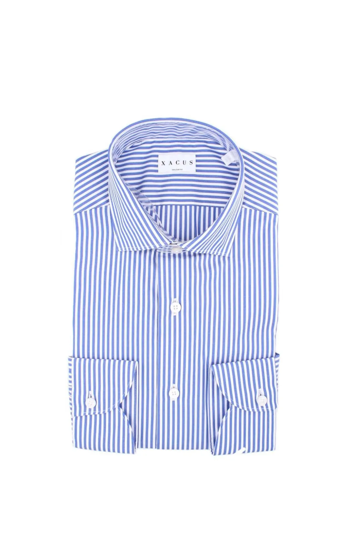 Camicia uomo Xacus, realizzata in cotone a righe bastoncino, collo con stecche estraibili, bottoni in madreperla, due riprese posteriori, vestibilità slim, 100% cotone.