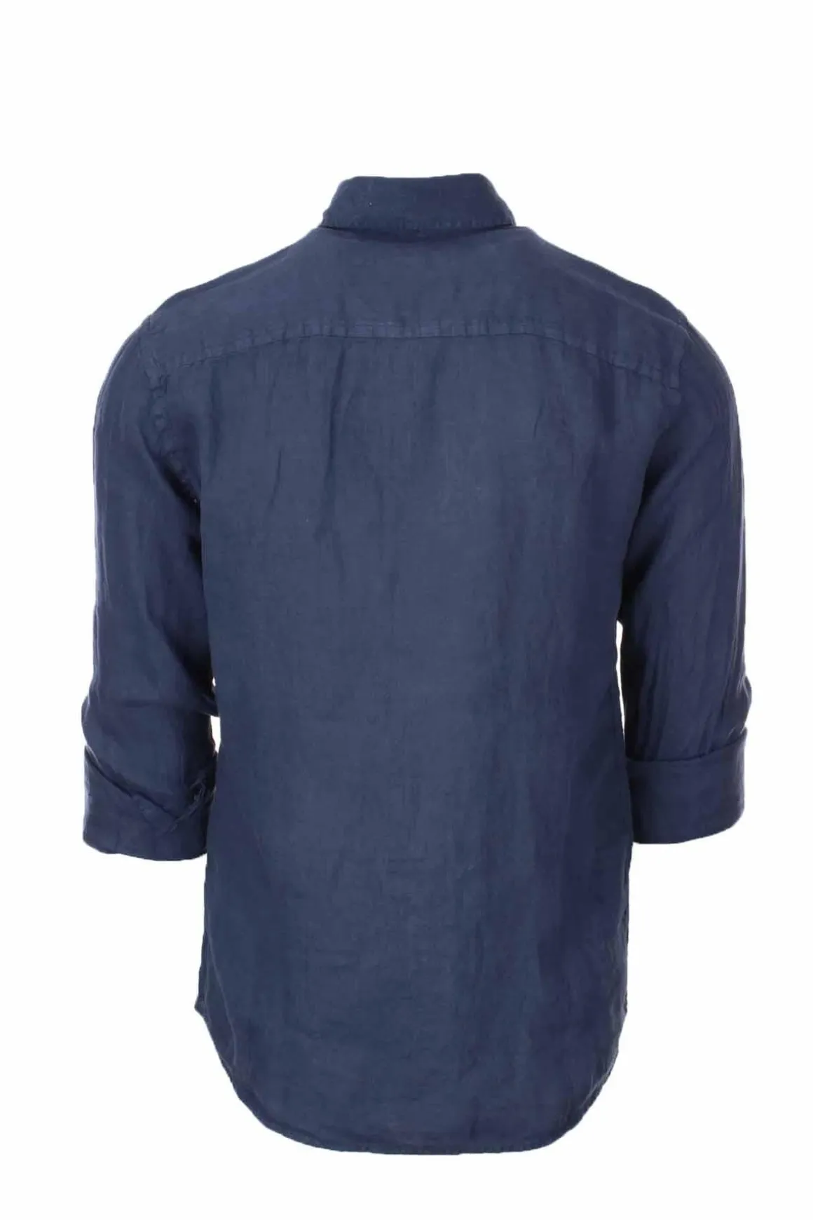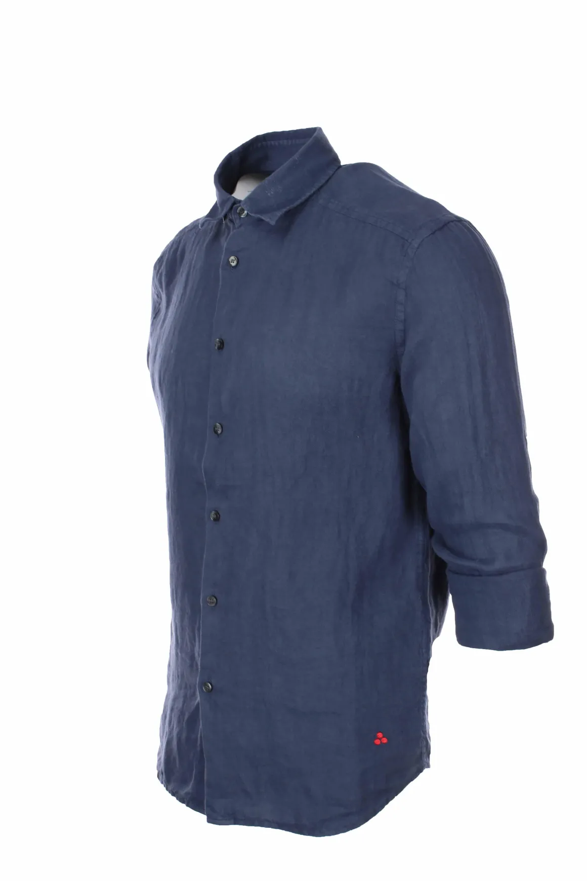 Camicia uomo manica lunga in lino, colletto morbodo sportivo, logo Peuterey con tre pallini rossi sul fondo, vestibilità regolare, 100% lino.