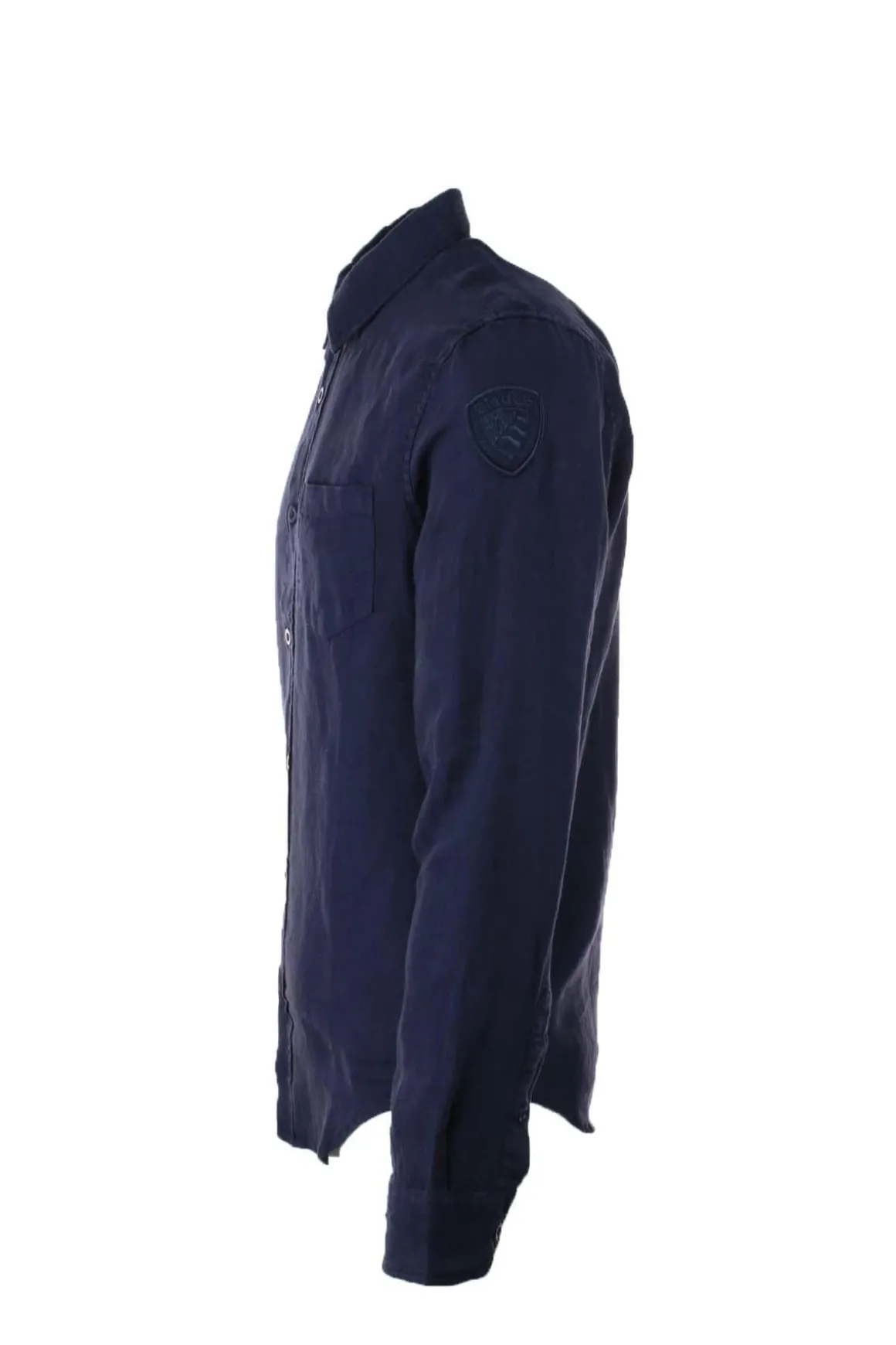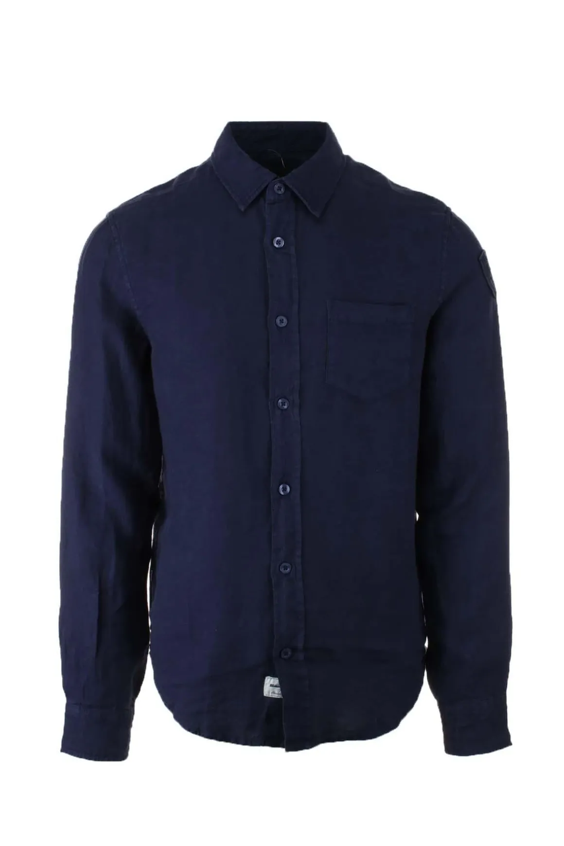Camicia uomo manica lunga in lino, colletto morbido, bottoni in tinta, scudetto Blauer sul braccio, vestibilità regolare, 100% lino.