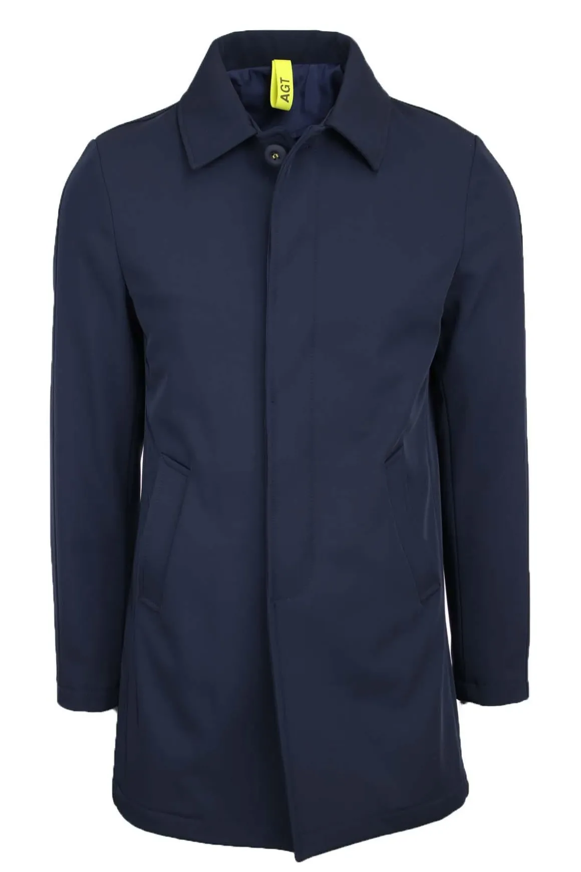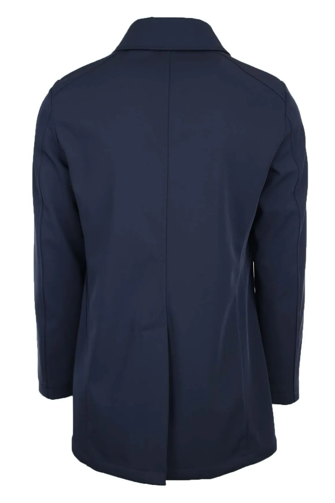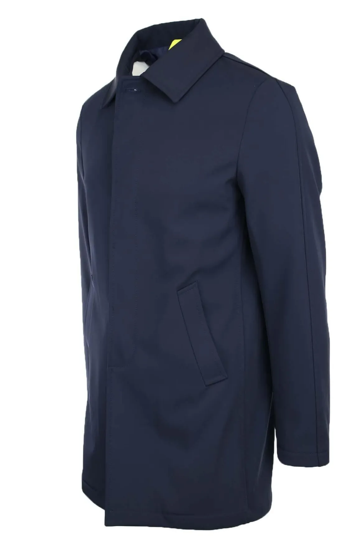 Cappottino trench sfoderato, realizzato in tessuto tecnico può essere usato come capo over grazie alla sua vestibilità slim fit ma anche come soprabito, chiusura con bottoni nascosti, tasche oblique ai fianchi, lunghezza sopra al ginocchio.