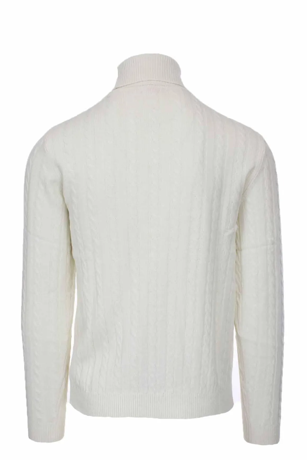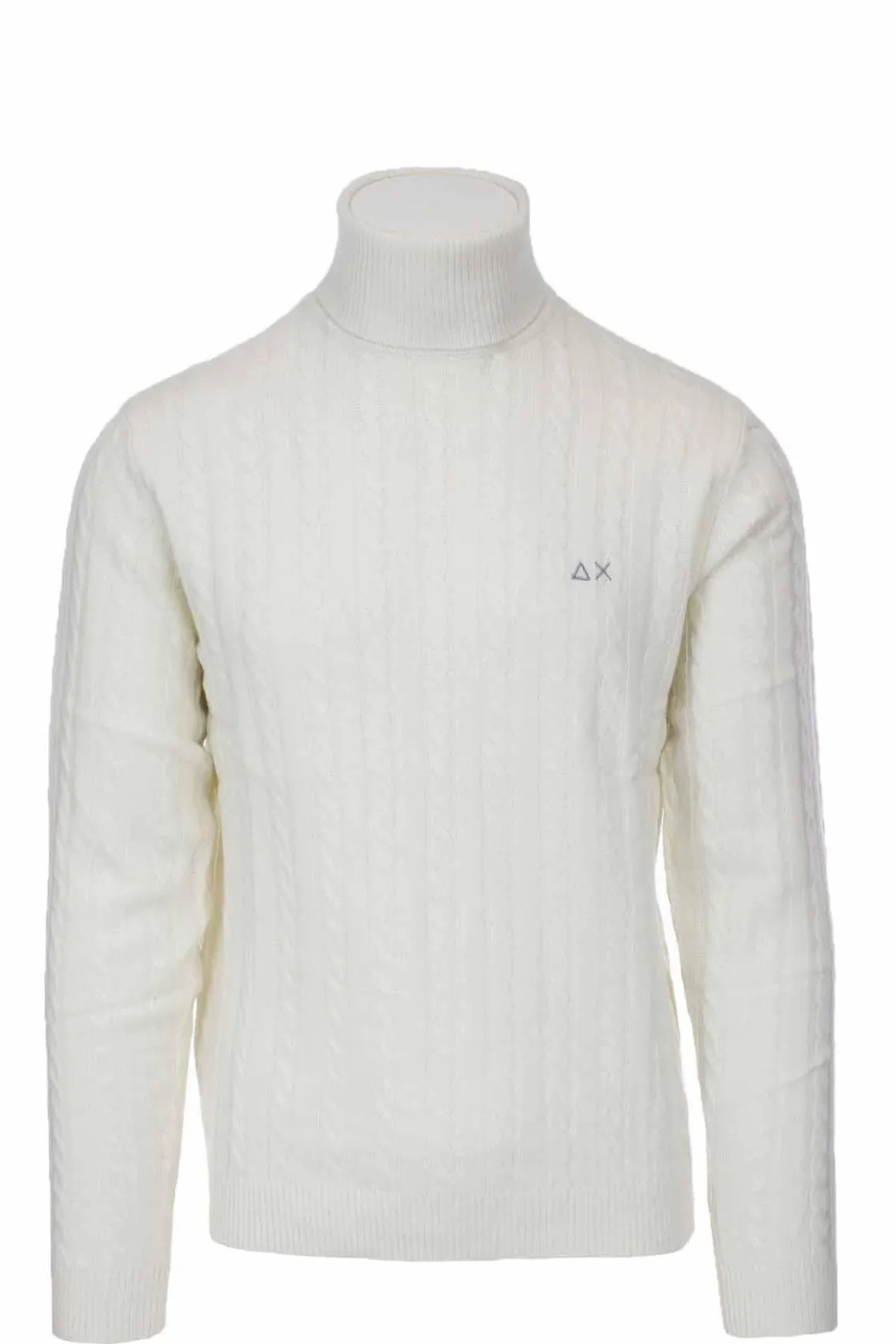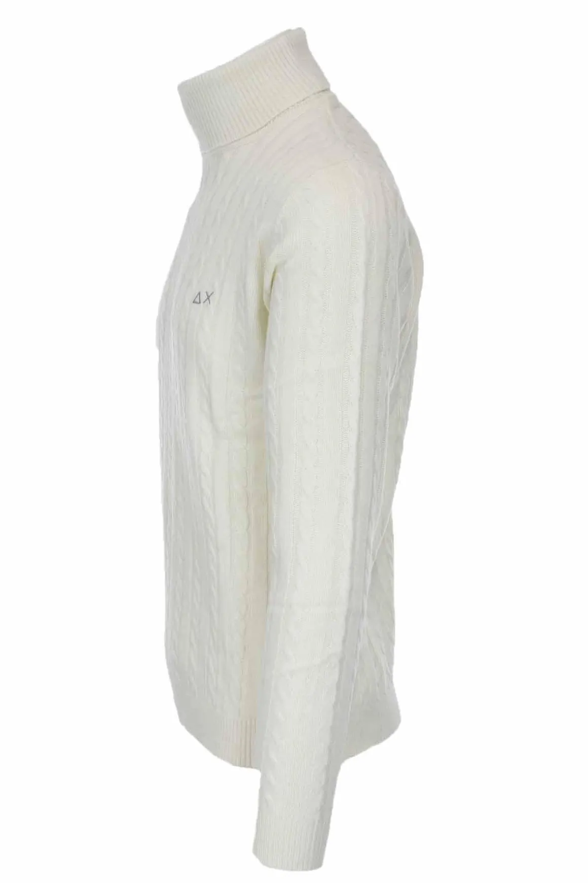 Dolcevita unito con lavorazione a trecce, realizzato in misto lana merino, polsini e fondo vita elasicizzati, logo Sun68 sul petto, 47% lana merino, 38% viscosa, 10% poliammide, 5% cachemire.