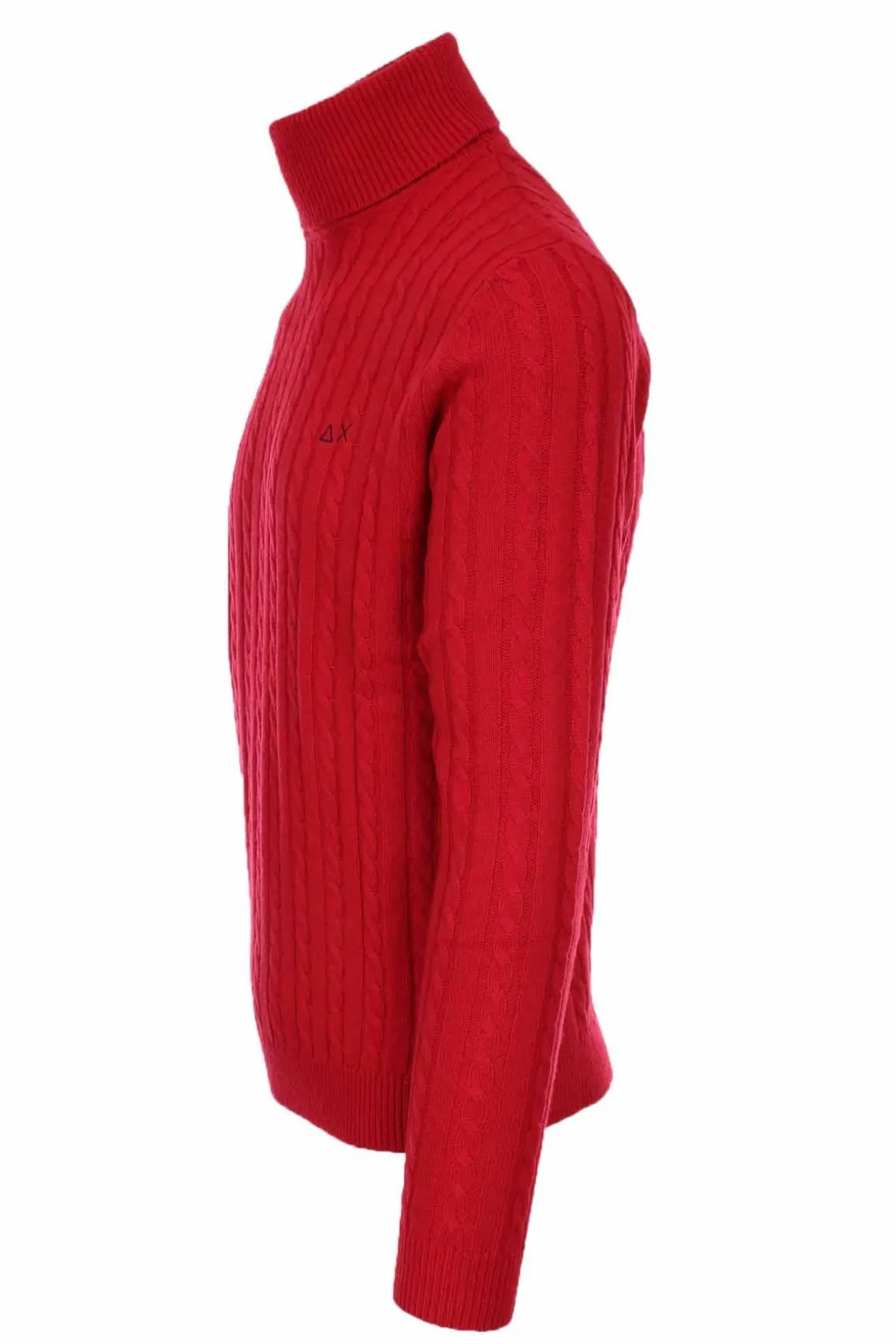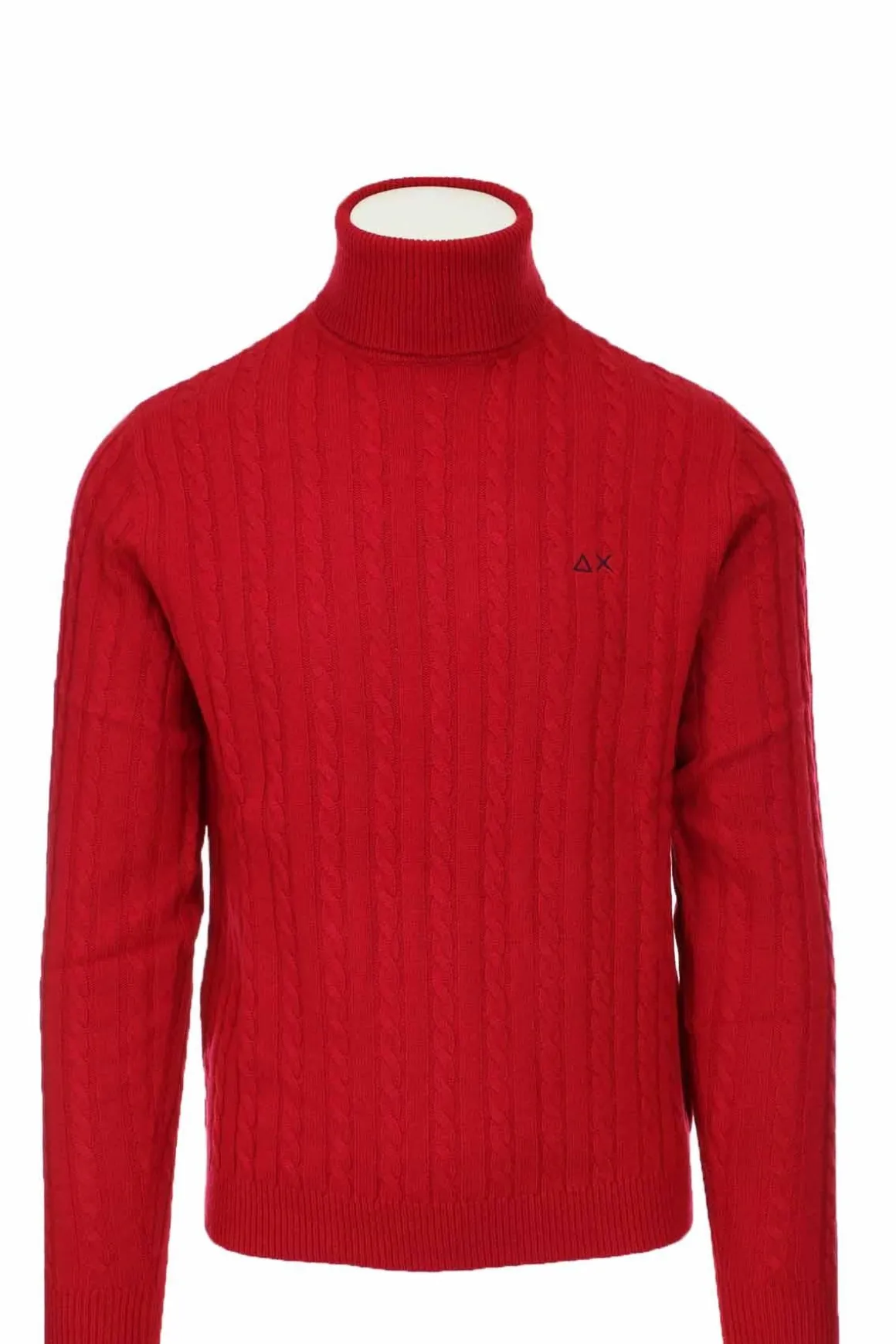 Dolcevita unito con lavorazione a trecce, realizzato in misto lana merino, polsini e fondo vita elasicizzati, logo Sun68 sul petto, 47% lana merino, 38% viscosa, 10% poliammide, 5% cachemire.