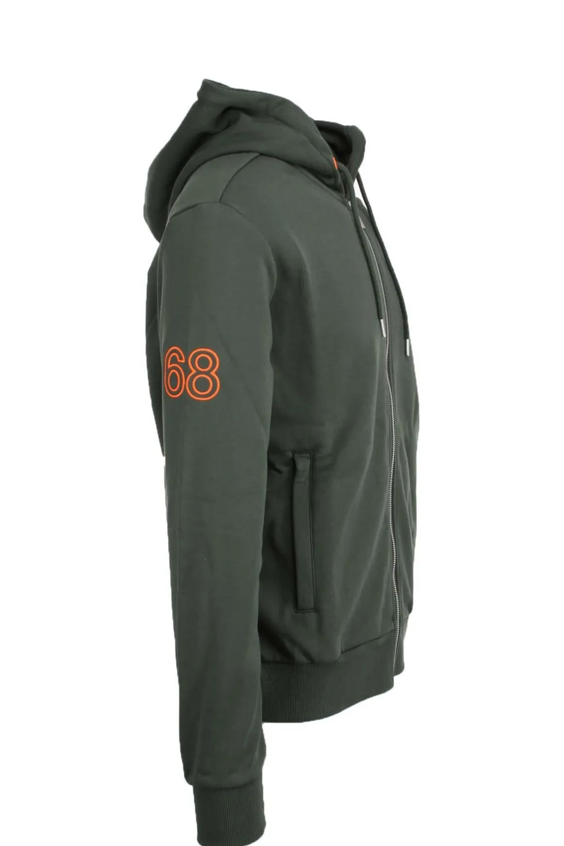 Felpa con cappuccio fisso, realizzata in felpa di cotone, chiusura con zip, tasche anteriori ai fianchi, polsini e fondo vita elasticizzati, logo e patch fluo, vestibilità regolare, 100% cotone.