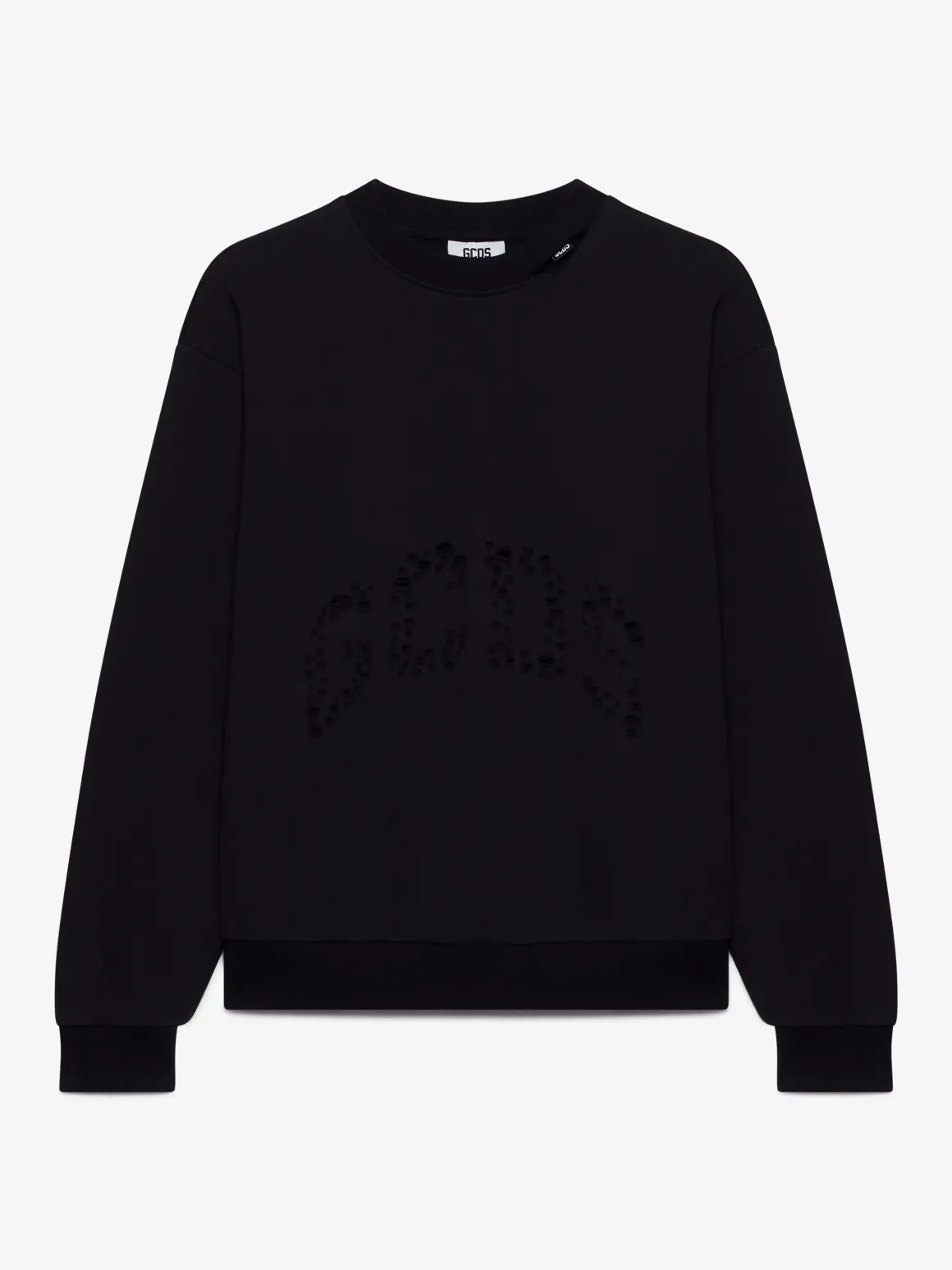 Felpa girocollo con logo ricamato in tinta GCDS e fori effetto used, polsini e fondo vita a costina elastica, vestibilità regolare, 100% cotone.