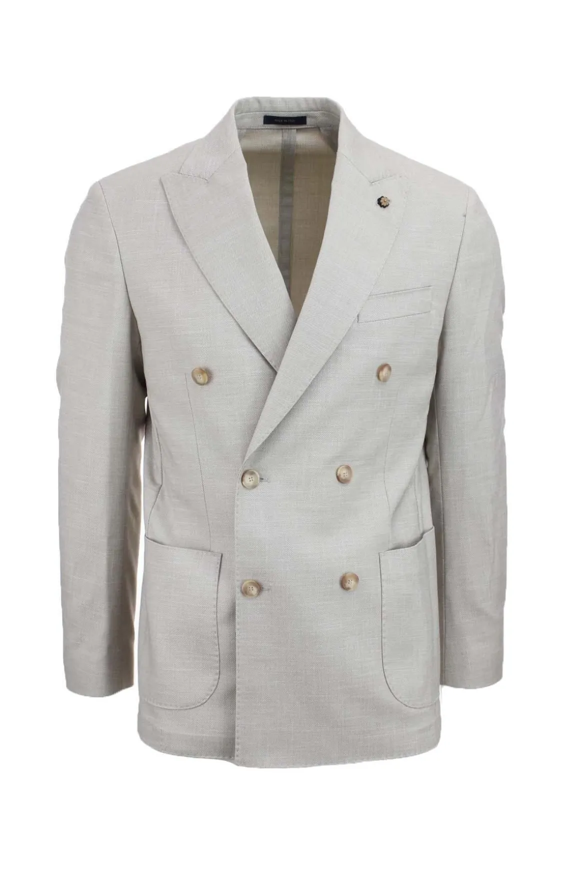 Giacca uomo doppiopetto 6 bottoni, realizzata in tessuto micropuntinato, leggero e morbido al tatto, tasche applicate, revers ampi, spacchetti laterali, interno sfoderato con tasche, vestibilità regolare, tessuto 85% poliestere, 13% viscosa, 2% elastan.