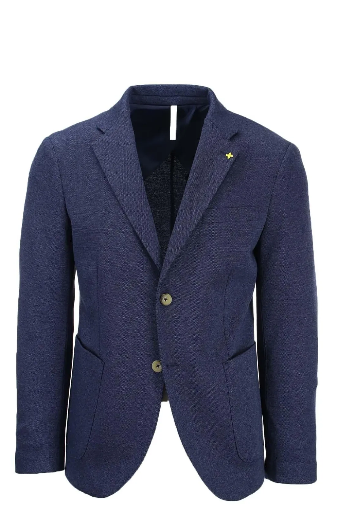 Giacca uomo monopetto 2 bottoni con spacchetti laterali, realizzata in tessuto stretch micropuntinato, tasche anteriori applicate, interno sfoderato con tasche, bordi impunturati in tinta, vestibilità regolare, 90% poliestere, 10% viscosa. Made in Italy.