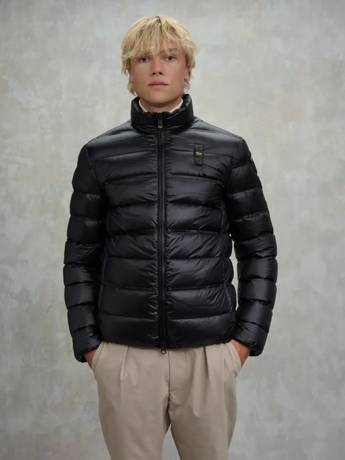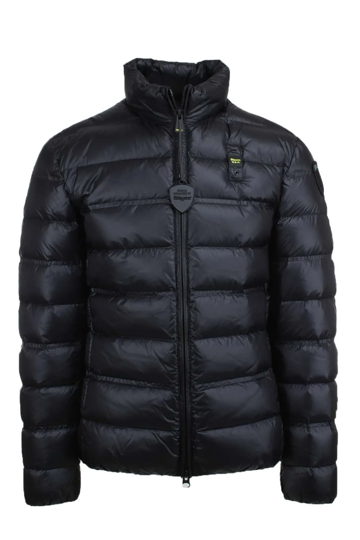 Giacca piumino senza cappuccio uomo Blauer, modello Belmont, collo alla coreana, chiusura con zip a scomparsa, tasche ai fianchi con zip, imbottitura in piuma naturale 185gr., impure orizzontali, identificativo passante e patch Blauer, elastico sul fondo vita, polsini con elastico, interno foderato in tinta con tasche, vestibilità regolare, si consiglia l’acquisto della taglia solita, tessuto 100% nylon.