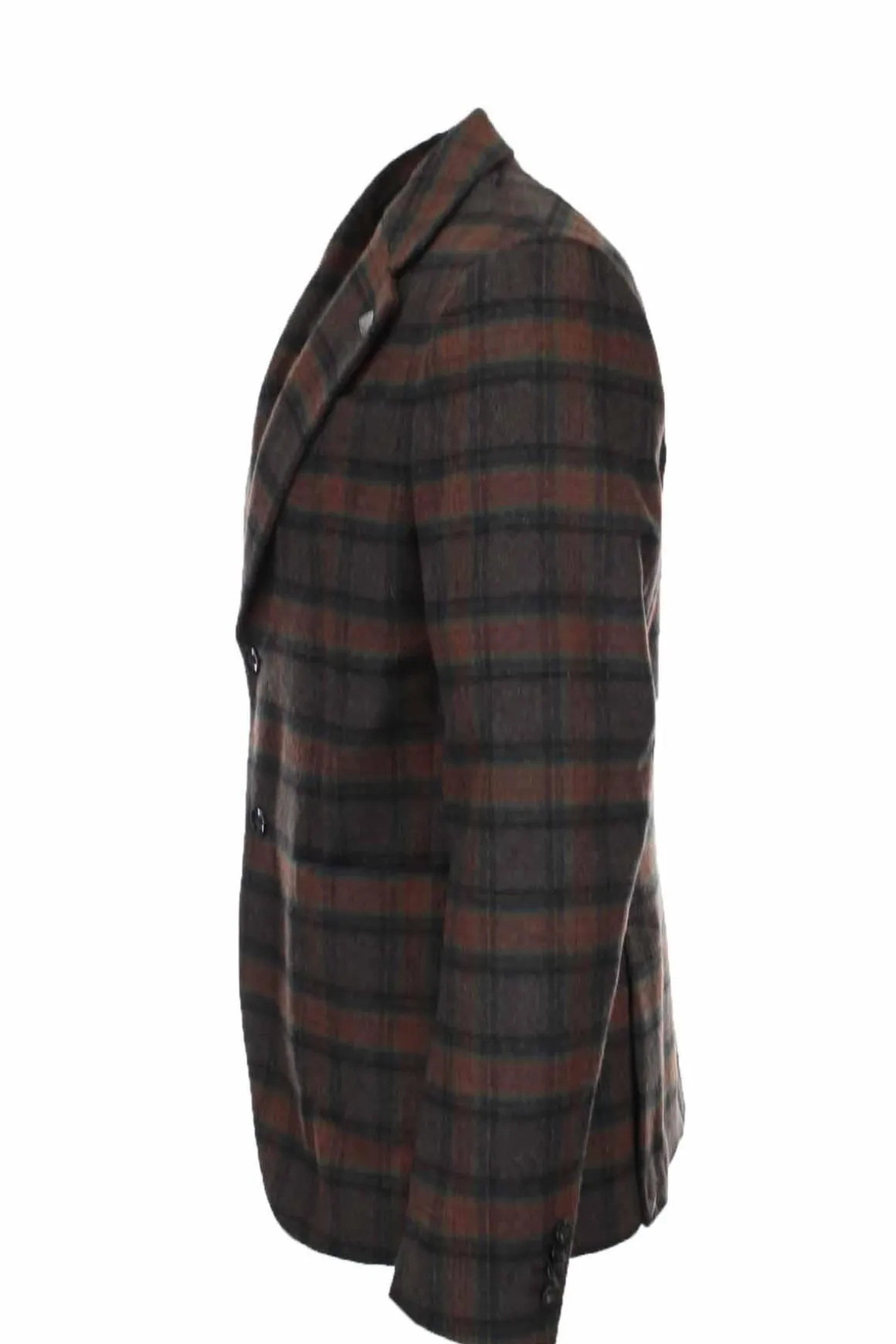 Giacca sfoderata a quadri in misto lana, rever ampio, 2 bottoni, spacchi laterali, tasche a toppa, tasche interne, vestibilità regolare, 65% lana, 30% poliestere, 5% altre fibre.