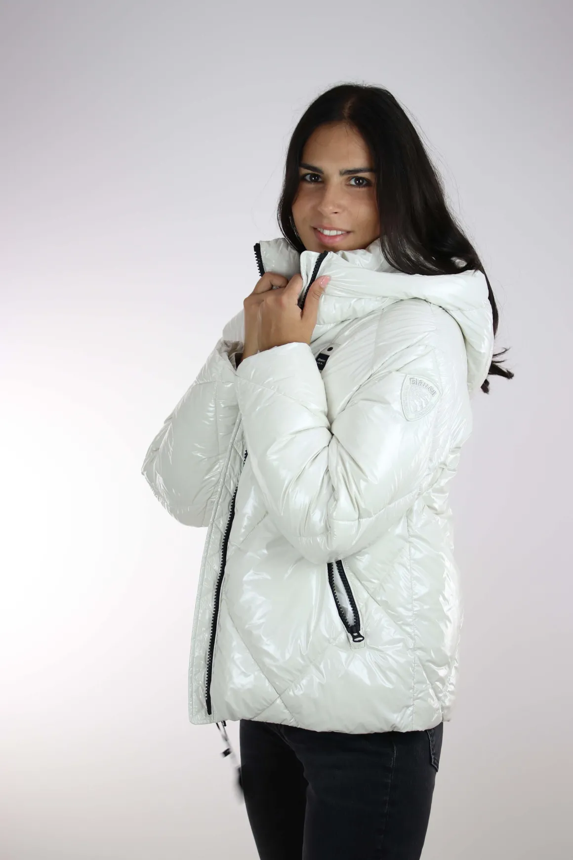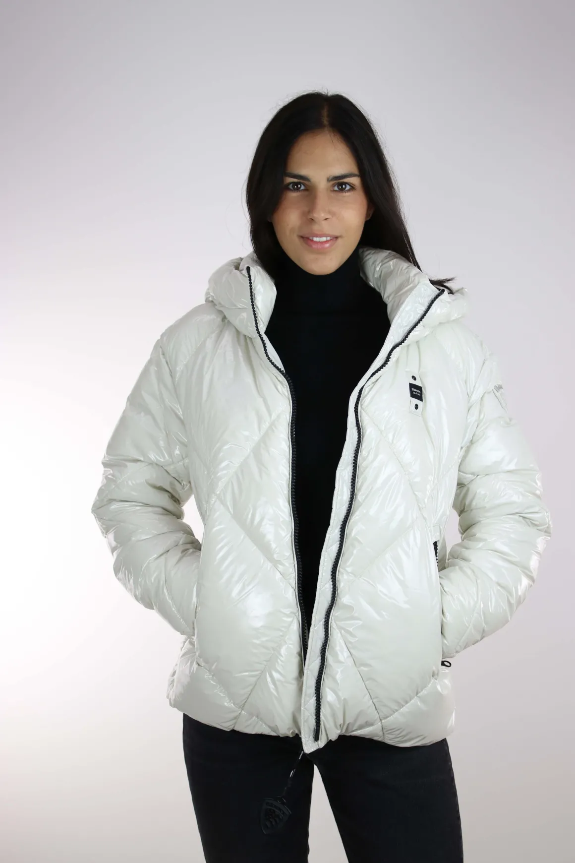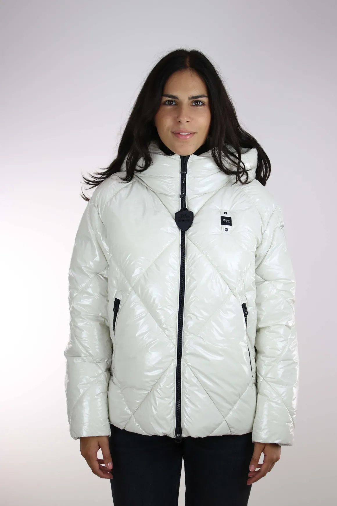 Giubbotto donna Blauer, realizzato in tessuto laccato lucido idrorepellente, imbottitura ecologica Sorona by Aura impunturato a rombi, cappuccio fisso, chiusura full zip, tasche ai fianchi con zip, coulisse regolabile sul fondo, interno foderato in tinta con tasche, vestibilità regolare, la modella è alta 175 cm e indossa la taglia S.