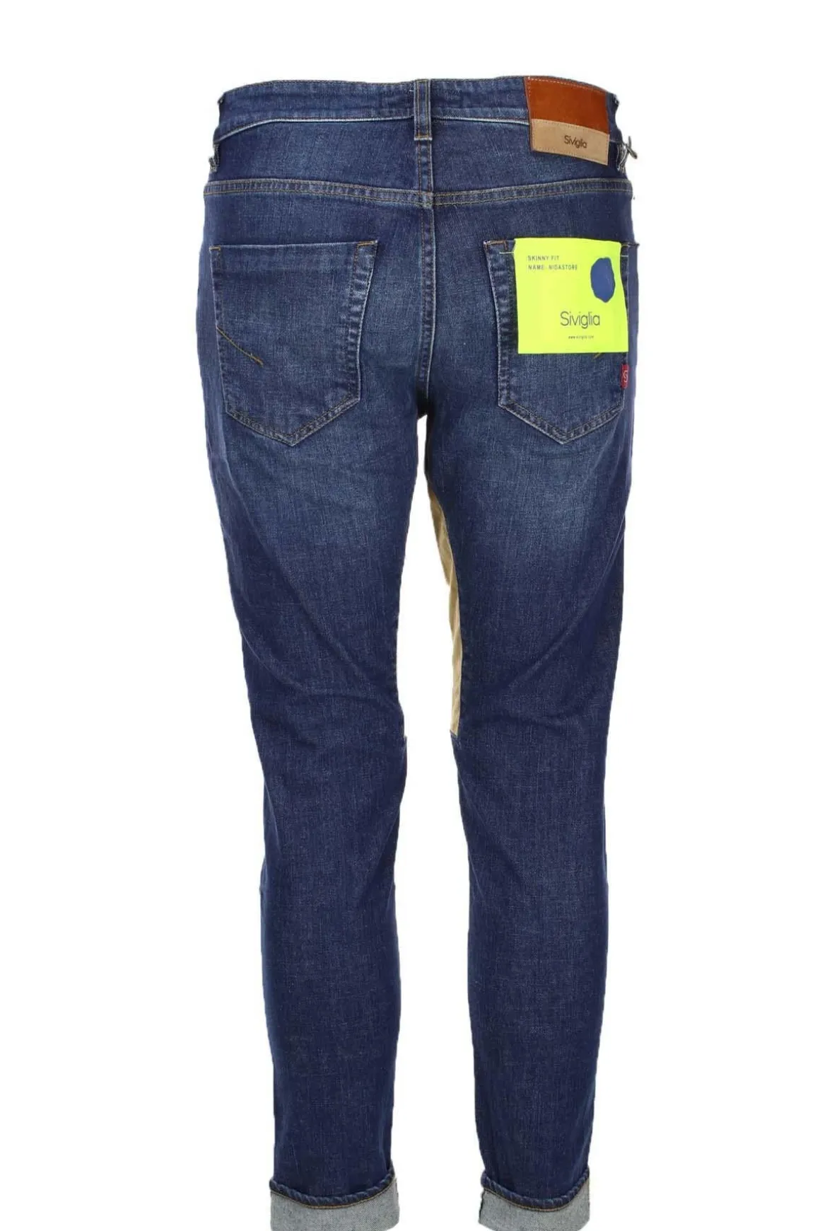 Jeans denim 5 tasche uomo Siviglia, realizzato in denim elasticizzato, toppe in alcantara beige, chiusura bottoni in metallo, cuciture oro, vestibilità regolare, 98% cotone, 2% elastan.