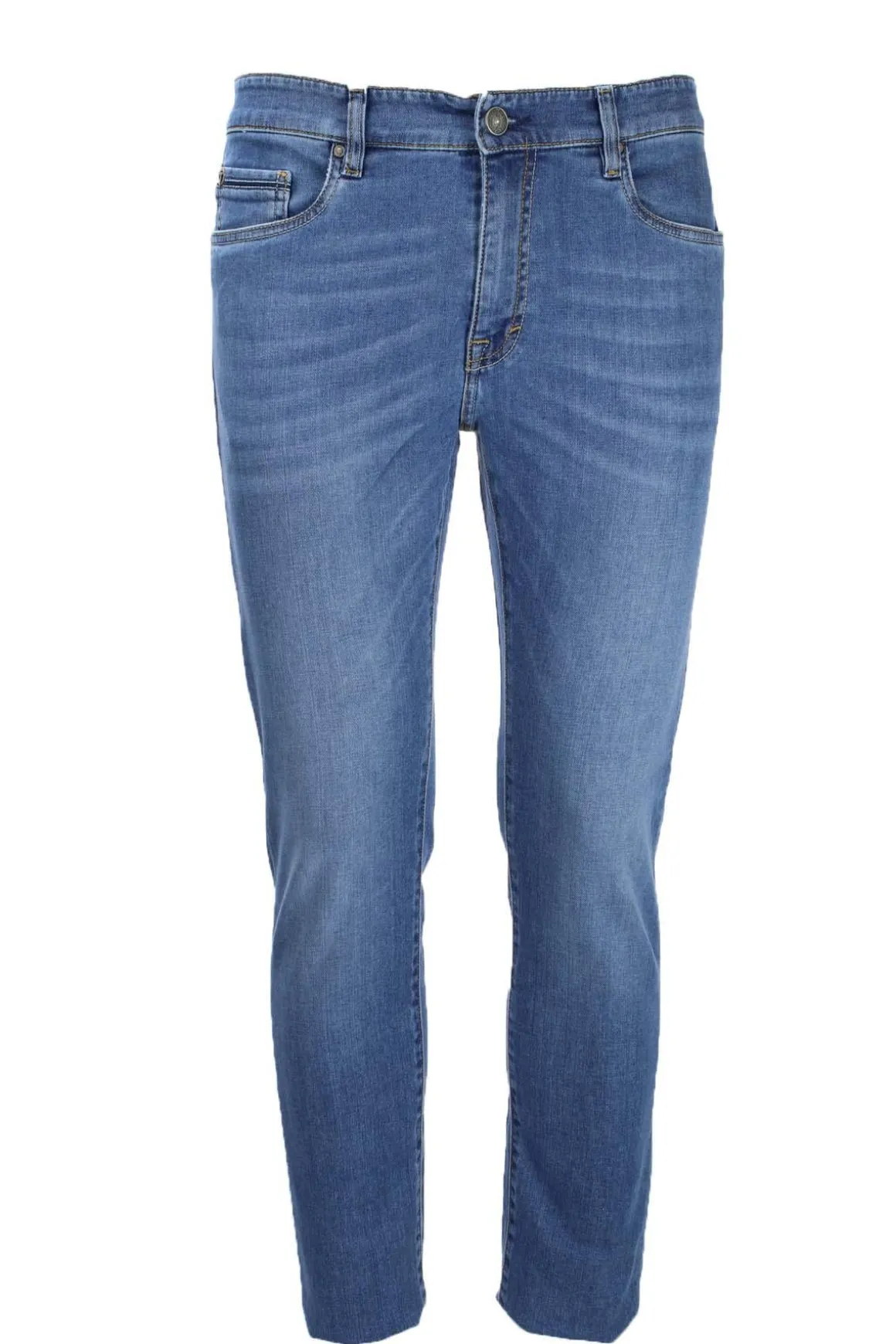 Vestibilità impeccabile per questo jeans uomo made in Italy firmato TeleriaZed, nasce dal mix di materiali pregiati e una sapiente manifattura, in questo modello chiusura con zip, borchie in metallo, cuciture in contrasto, lavaggio medio, vestibilità regolare slim fit, fondo 17 cm, 97% cotone 3% elastan.
