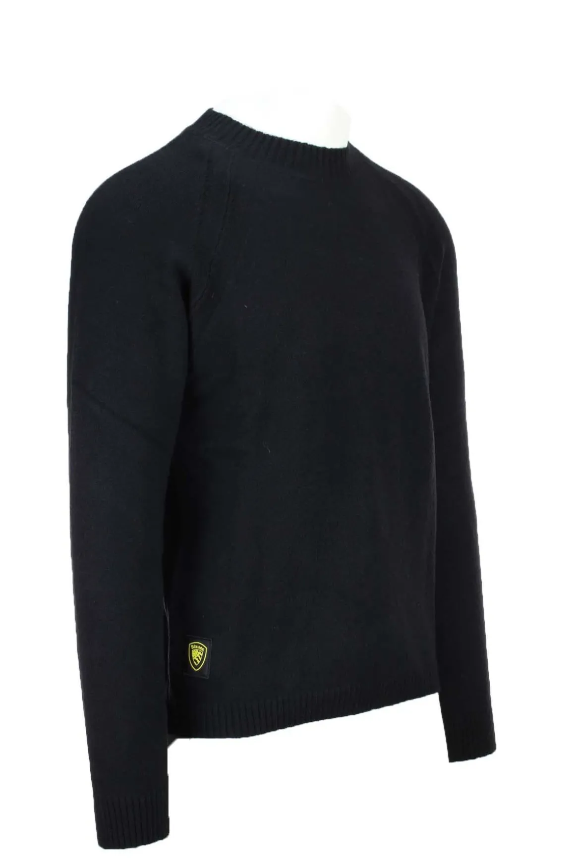Maglia uomo Blauer realizzata in morbido filato misto lana, collo cratere, maniche raglan, polsini e fondo vita elasticizzati, logo Blauer, vestibilità regolare, 44% acrilico, 25% poliammide, 18% poliestere, 13% lana.