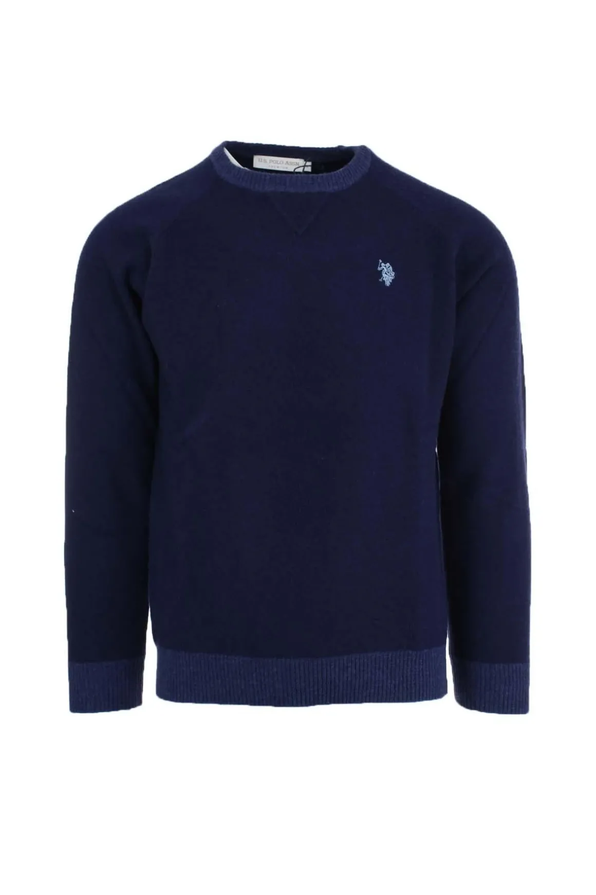 Maglia Pullover uomo in lana con profili in contrasto, taglio felpa e manica raglan, pesantezza media, logo US Polo, polsini e fondo vita elasticizzati, vestibilità regolare, 70% lana, 30% cachemire.