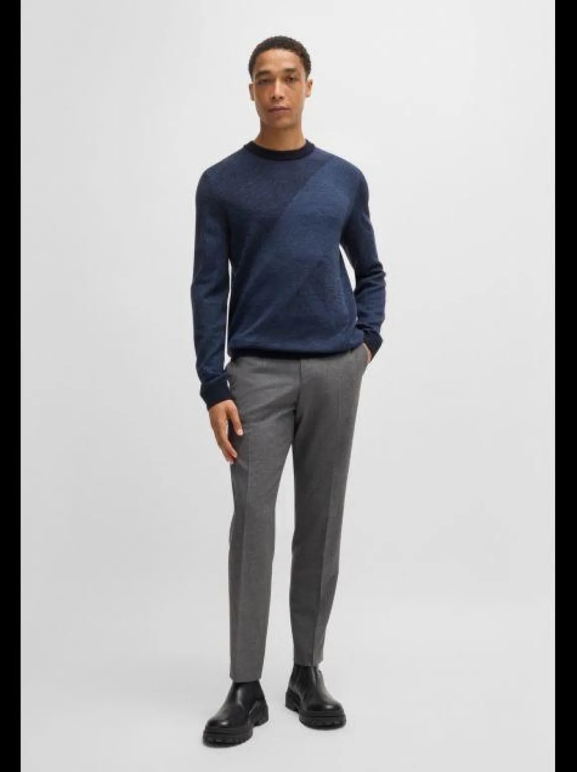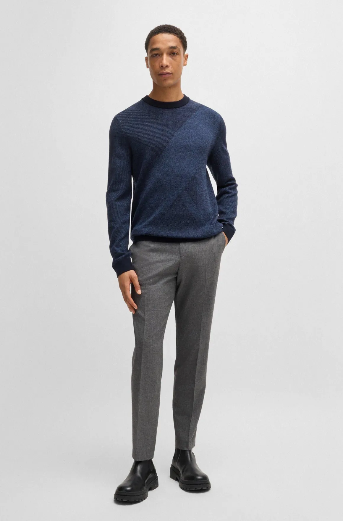 Maglia pullover in lana Boss, lavorazione jaquard bicolore, realizzato in pura lana per un confort e leggerezza unici, polsini e fondo vita elasticizzati, pesantezza media, vestibilità regular fit.