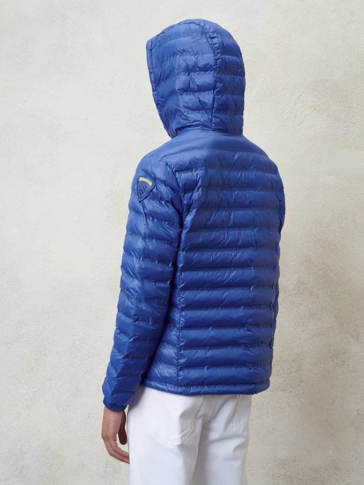 Giubbotto piumino con cappuccio, imbottitura 80 grammi in Repreve esclusiva Blauer, trapuntato orizzontale, chiusura centrale con zip doppio cursore, passante e patch Blauer, maniche con elastico, fondo vita con coulisse regolabile, interno con tasca, nylon 100%.
