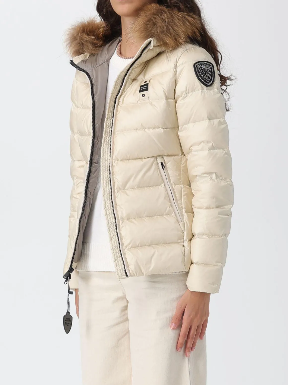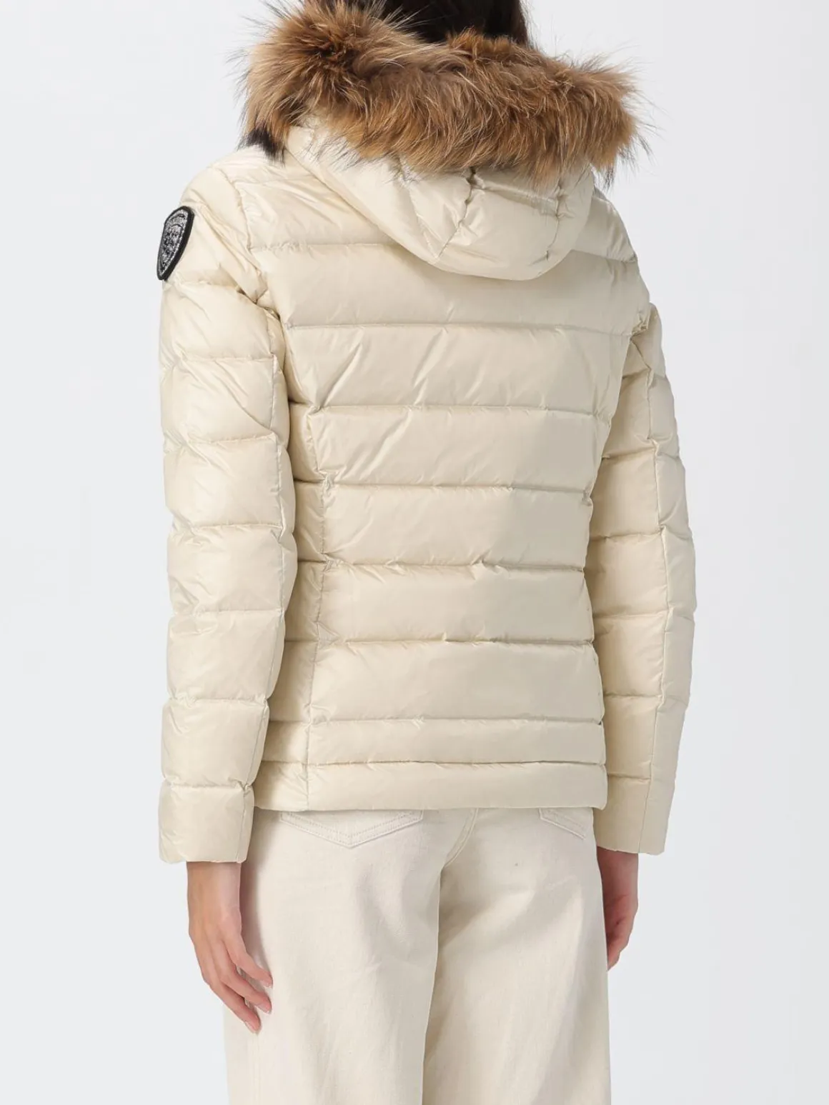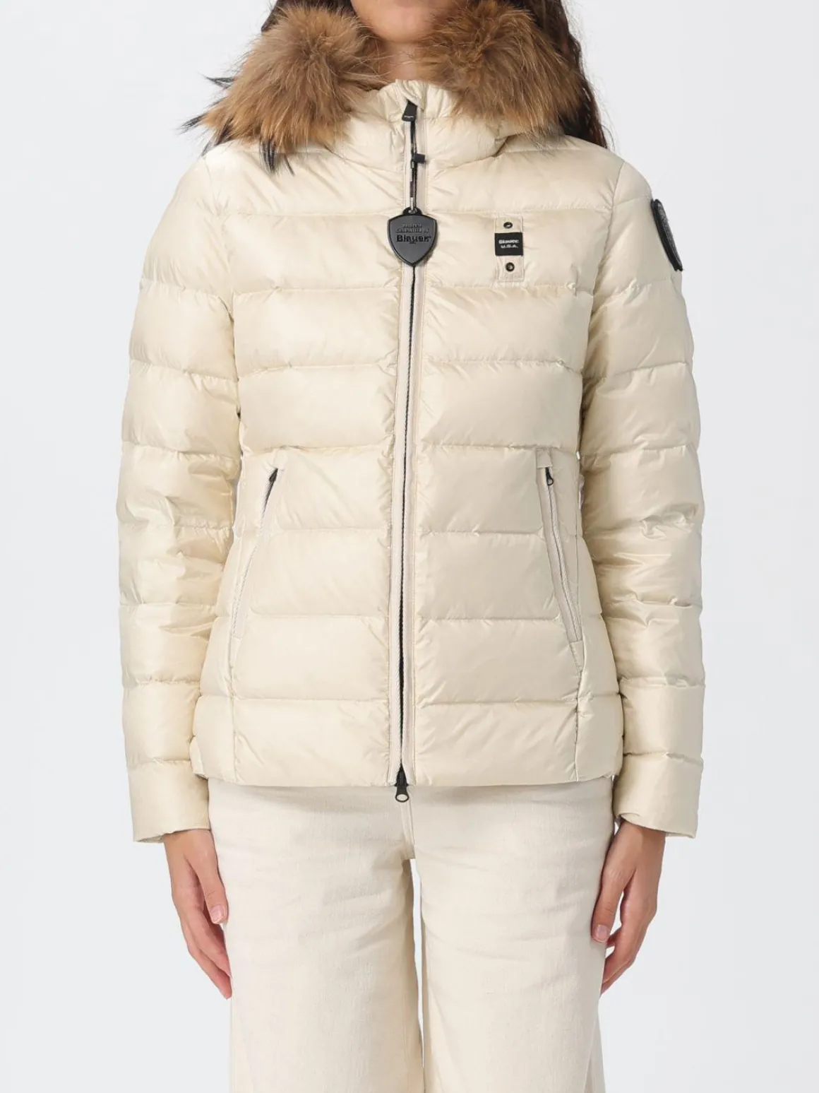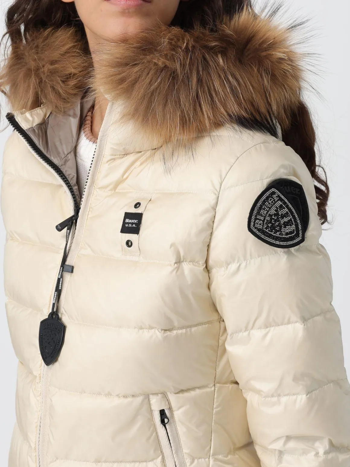 Piumino donna Blauer modello Aldie, cappuccio fisso bordato in pelliccia rimovibile, trapuntato a onde con imbottitura in vera piuma 165gr., il capo iconico della collezione Blauer riconoscibile dal Patch sul braccio glitter luccicante, chiusura con zip a scomparsa, tasche anteriori, elastico rigato sul fondo e sui polsini, cappuccio fisso, fodera in contrasto di colore, la modella è alta 1,79 cm e indossa la taglia S.