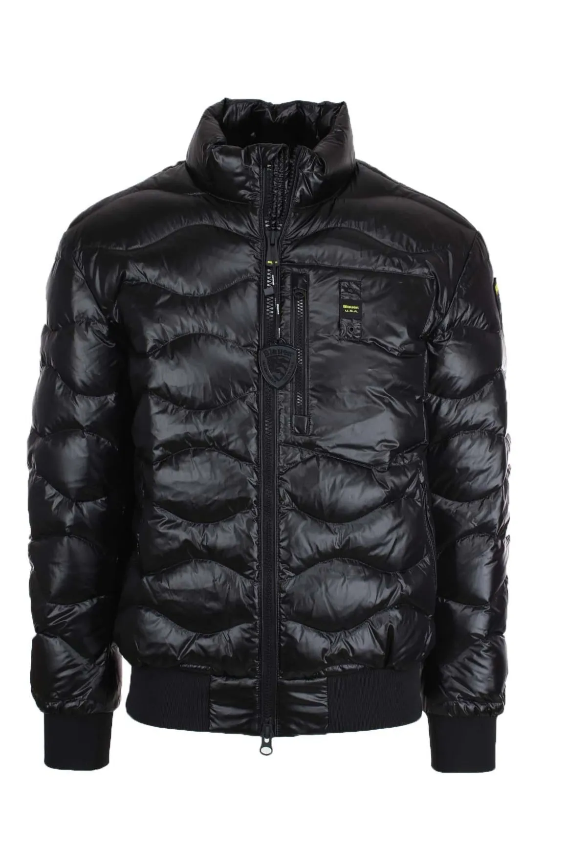 Piumino uomo, impunturato a onde con taschino sul petto e zip, polsinio e fondo vita elasticizzati, colletto alla coreana, Patch e passante Blauer, imbottitura in piuma naturale 150gr. calda e poco ingombrante, vestibilità regolare.