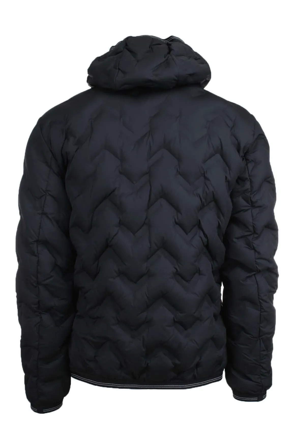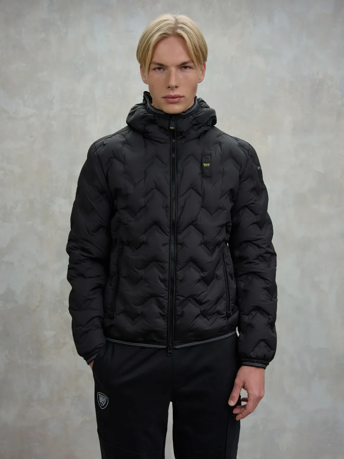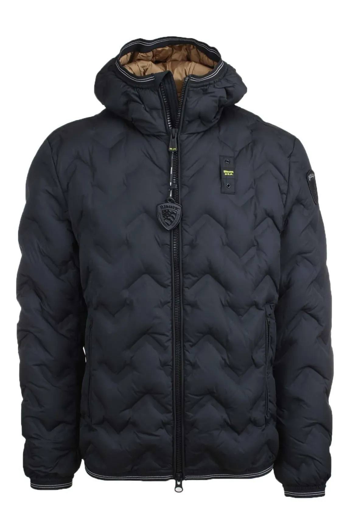 Novità della collezione Blauer uomo, il piumino Piery con cappuccio fisso e impunture asimmetriche, realizzato con l’esclusivo tessuto in poliestere, imbottito in piuma 190 gr., chiusura centrale con zip, tasche ai fianchi con zip, fondo vita e polsini con elastico rigato, interno foderato in contrasto di colore con tasche, patch e passante Blauer, vestibilità regolare.